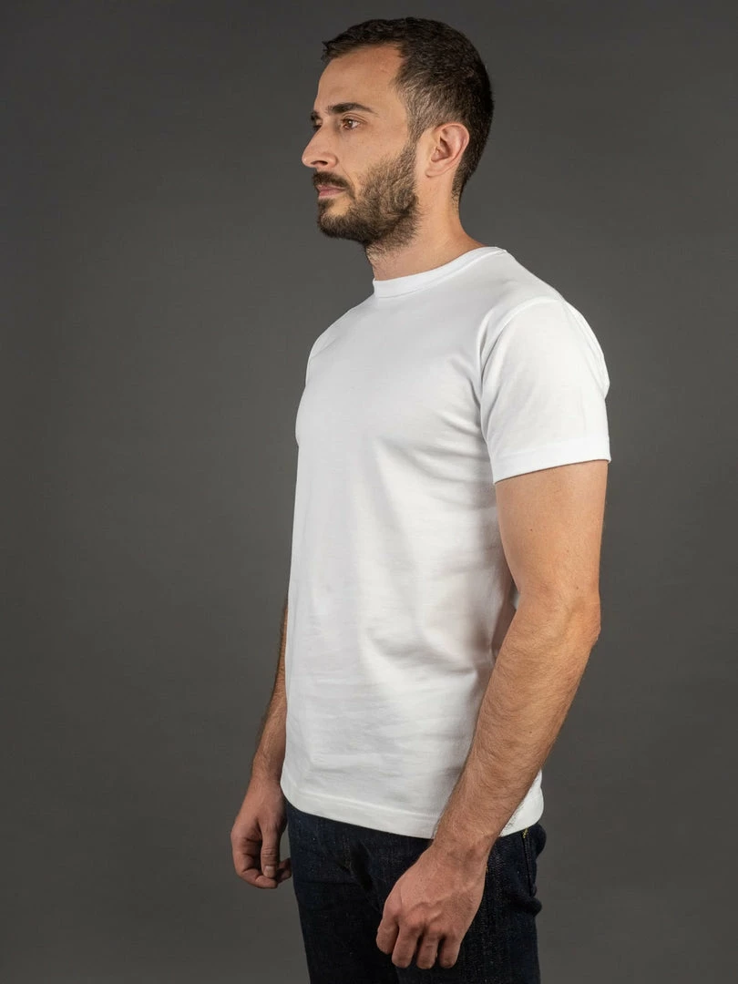 The material is then cut and sewn in San Francisco, CA in the same factory where their jeans are made. The tees have a triple needle coverstitched never-sag collar that stays tight around the neck over extended wears. T-shirts ship in a pack of two.