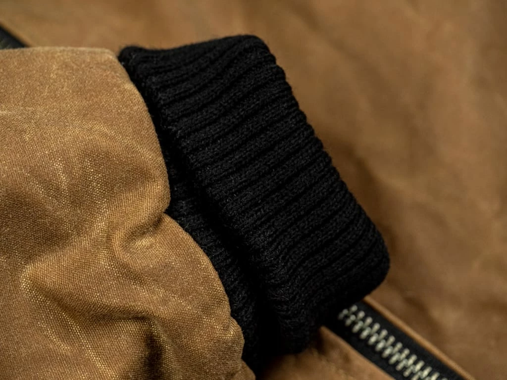 The jacket is completely made in the USA, and it is lined with a black quilted Thermolite jersey and is finished with heavyweight varsity jacket ribbing and a gunmetal YKK double zip.