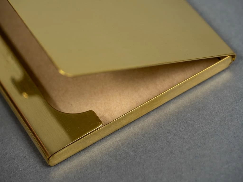 This is a unique business card case made of brass. It is hand-crafted and has a high-shine polished finish that will age from oxidization after use with a stunning result.