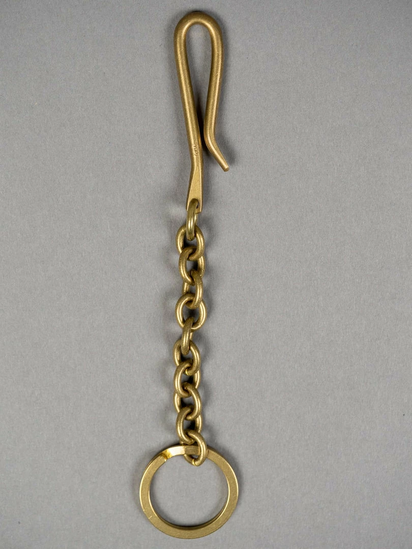 The original solid brass key hook made from the straight brass rod is handmade by a second-generation metal craftsman family. The curved shape fits the body; it is perfect for belt loops, coin pocket, belt or waistband. A master machine operator weaves the vintage-feel solid brass using a +100 years old a chain-making machine. The wire rolled rings selected are made by a speciality wire rolled ring company founded in 1972 in Tokyo. The solid brass double ring is produced by a small metal hardware supplier based over 80 years ago in Tokyo.