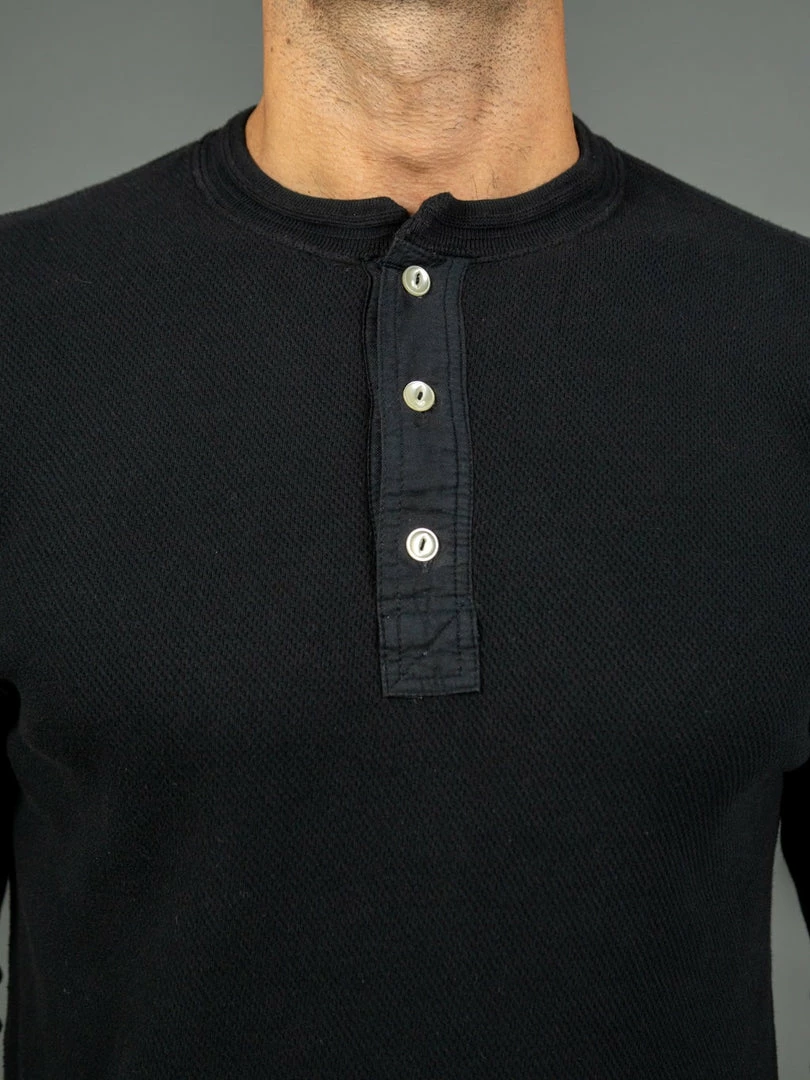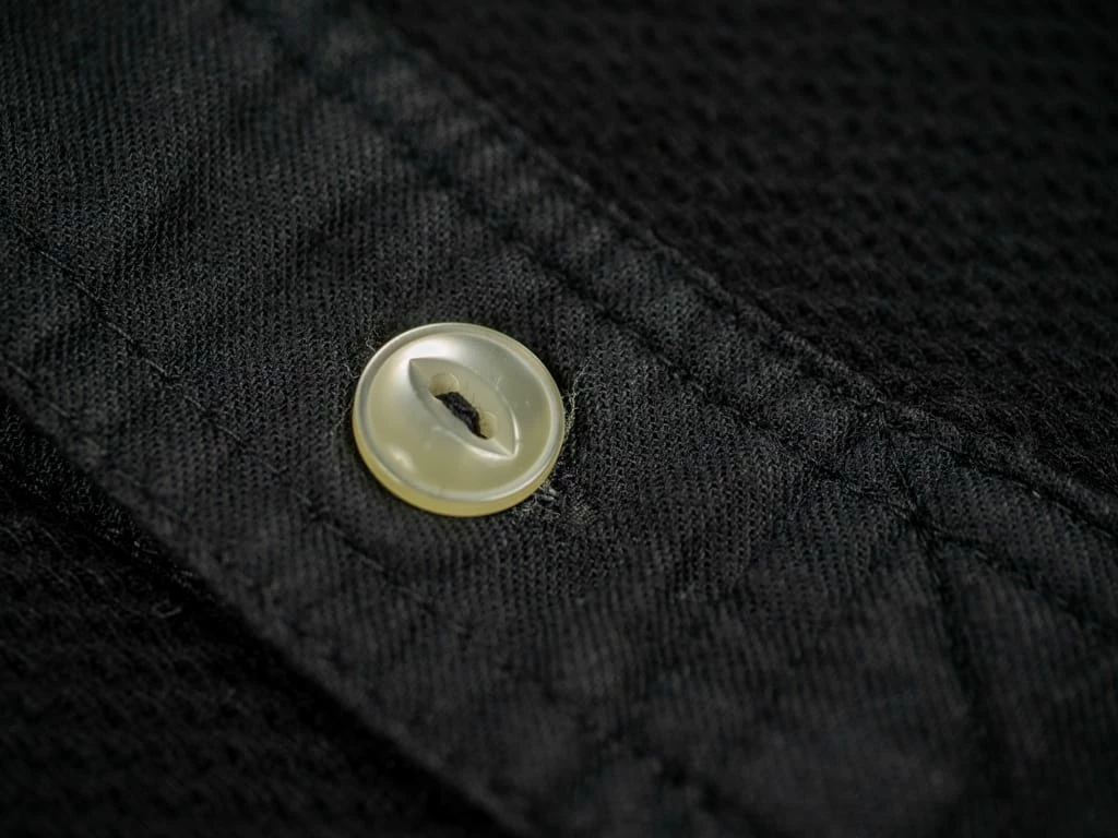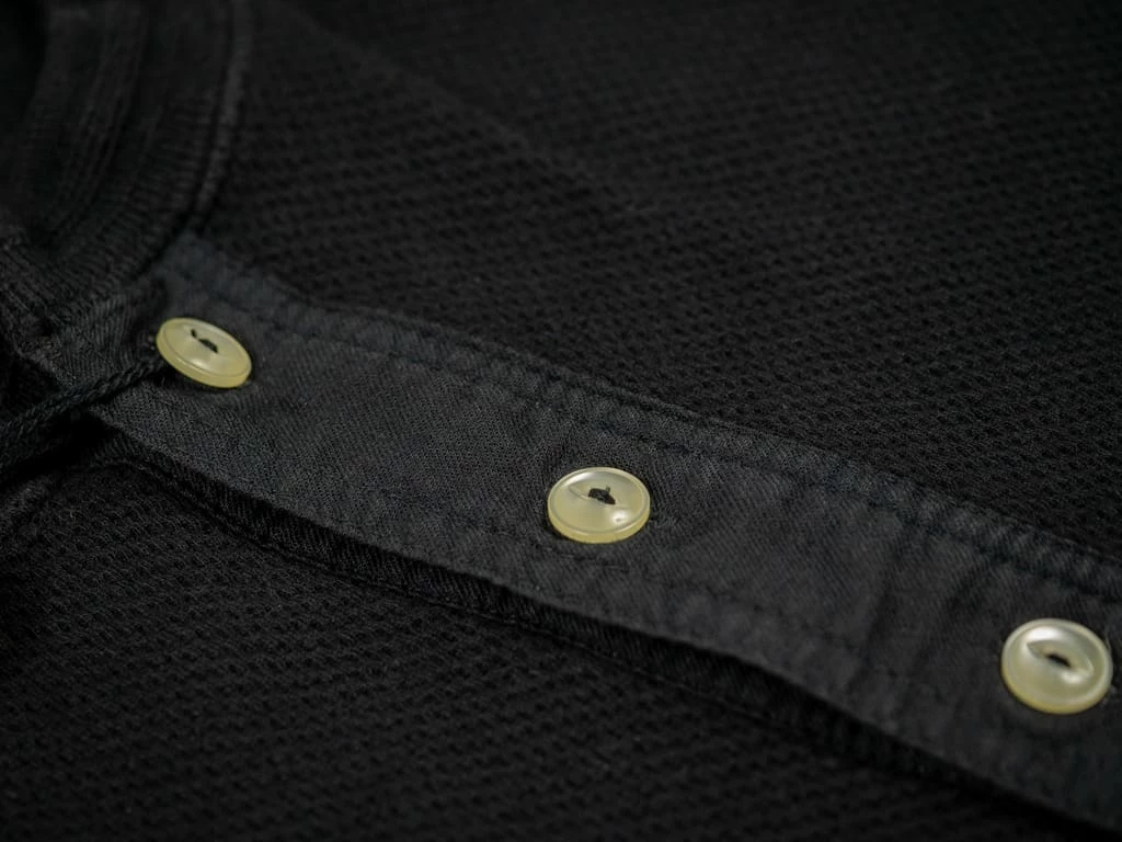 This Fine Aran Honeycomb Henley impresses at first sight for its unique real mother-of-pearl buttons and premium double face honeycomb cotton fabric knitted in Wakayama, Japan.