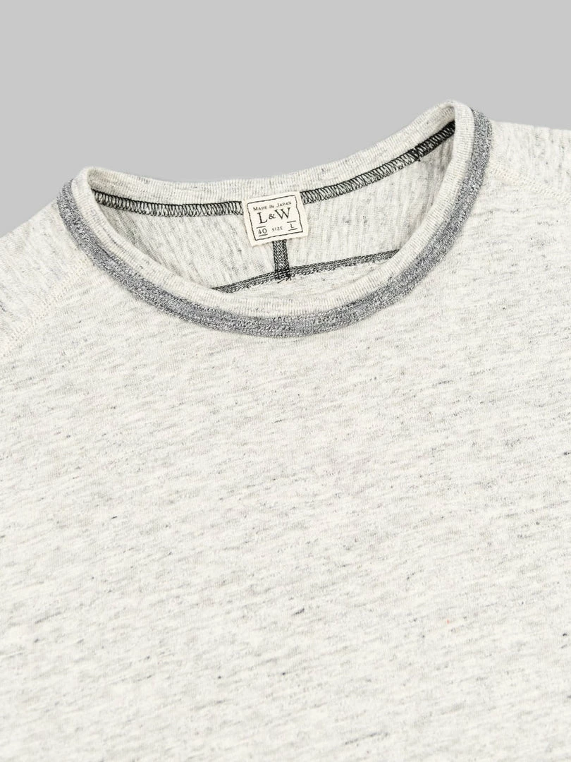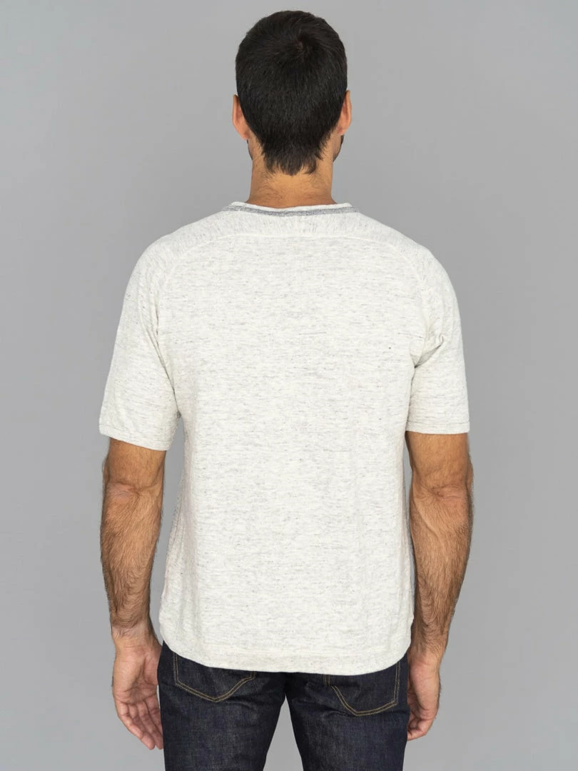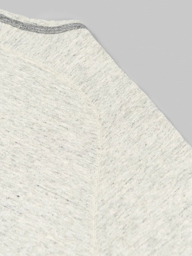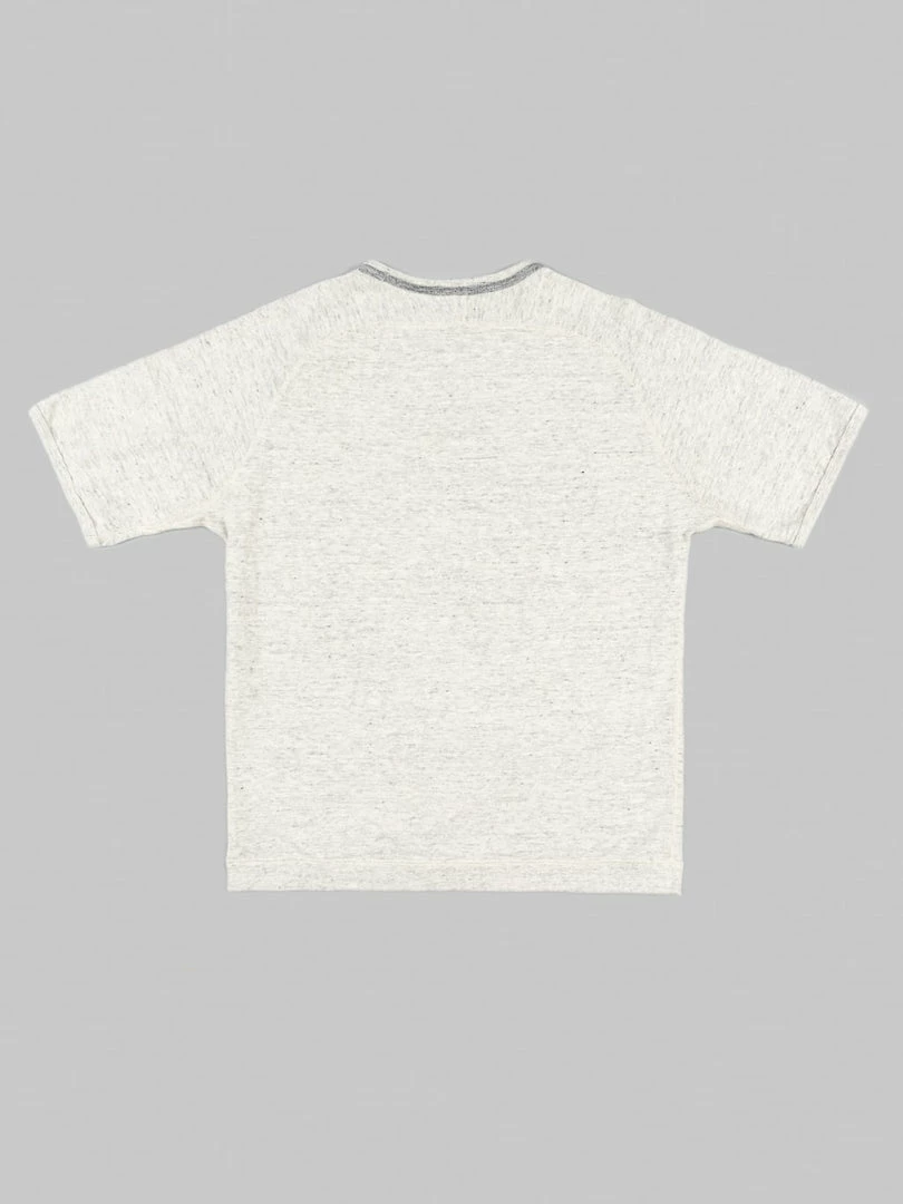 This short-sleeve masterpiece features a crew neck, raglan S-shaped freedom sleeves, ribbed binder cuffs, and a narrow ribbed hem. It’s constructed with four-needle flat seam stitching using vintage Union Special machines. The ribbed tapping around the collar prevents the neck from sagging and increases durability. Those kinds of details require a lot of time and skill to achieve.