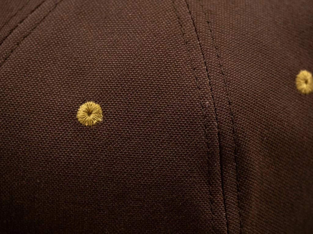 You can cap off your look with this robust brown and beige cotton twill combination in the classic six-panel style. This cap is adjustable with a leather strap and decorated with a Might Shine label. Additionally, six ventilation holes add functionality.