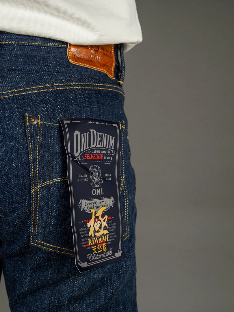 The ONI Kiwami fabric is inspired by the “Awa-Shoai (阿波正藍)” traditional dying method. When weaving Kiwami, arranging the light and dark coloured rope dyed natural indigo threads in well balanced were required. Bringing detailed work and expertise, Kiwami could weave. It is as if denim just looks like “Awa-Shoai (阿波正藍)” denim, which is woven with shades of indigo blue threads hank dyed by craftsman. Kiwami is really great rope dyed natural indigo denim; there is nothing like others. Moreover, because threads are dyed by the rope dyeing method, threads’ cores are white so that you can enjoy colour fades, gradation and ageing of denim. You cannot do it with the hank dyeing method because the threads are dyed to the core.