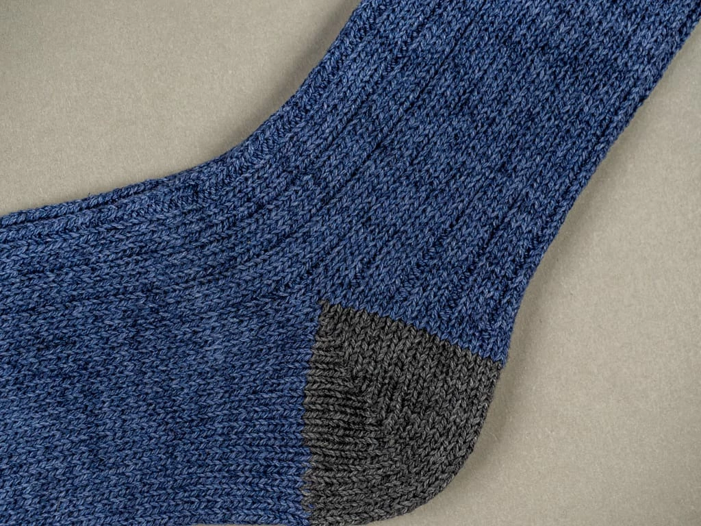The most fitting for this sock was unevenly dyed recycled cotton yarn. We are not talking about cotton recycled from worn garments, by “recycled cotton,” we mean 100% virgin cotton; yarn made of fibres that were too short to be spun into regular cotton yarn.