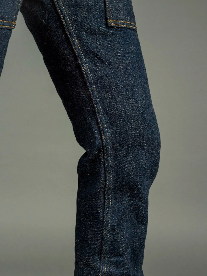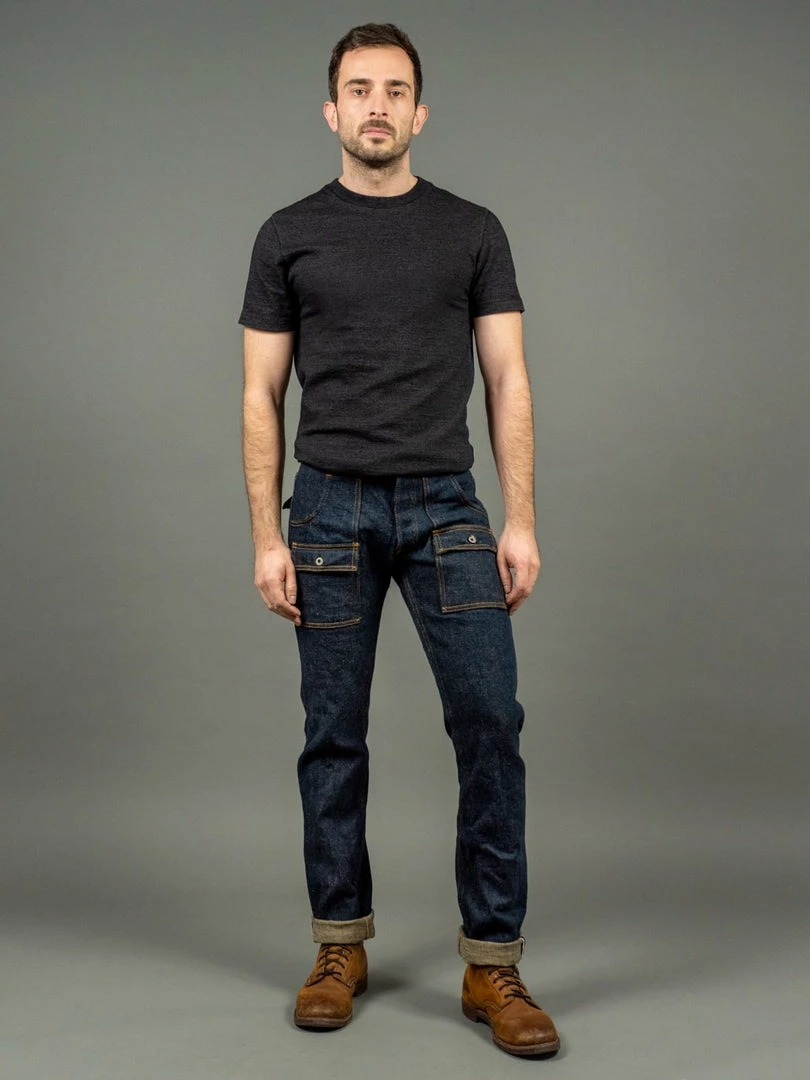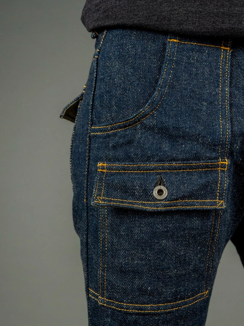 - 20oz unsanforized indigo rope dyed Japanese selvedge denim. It is a one-wash version so expect no shrinkage
