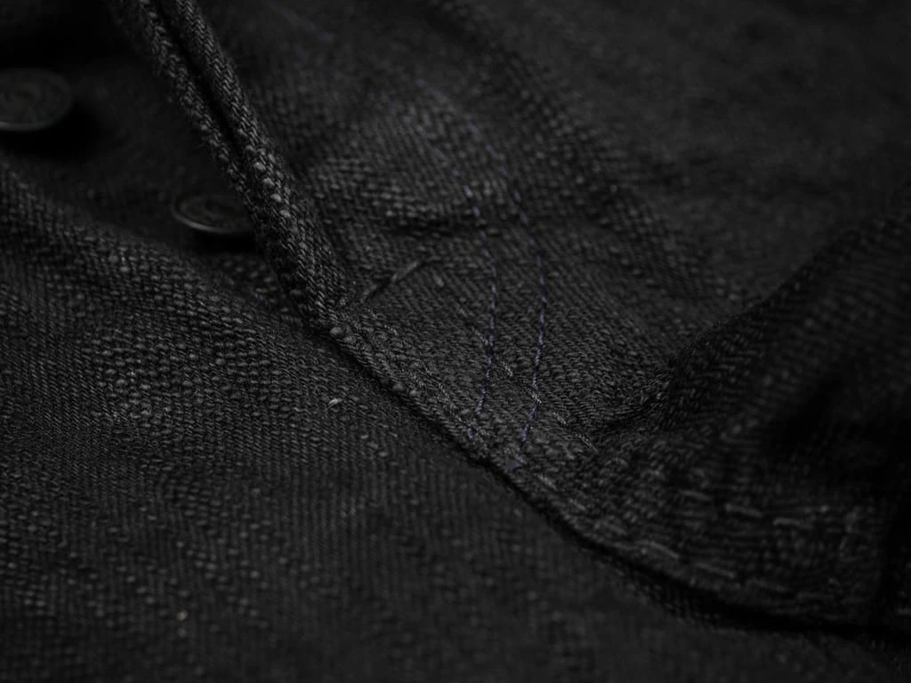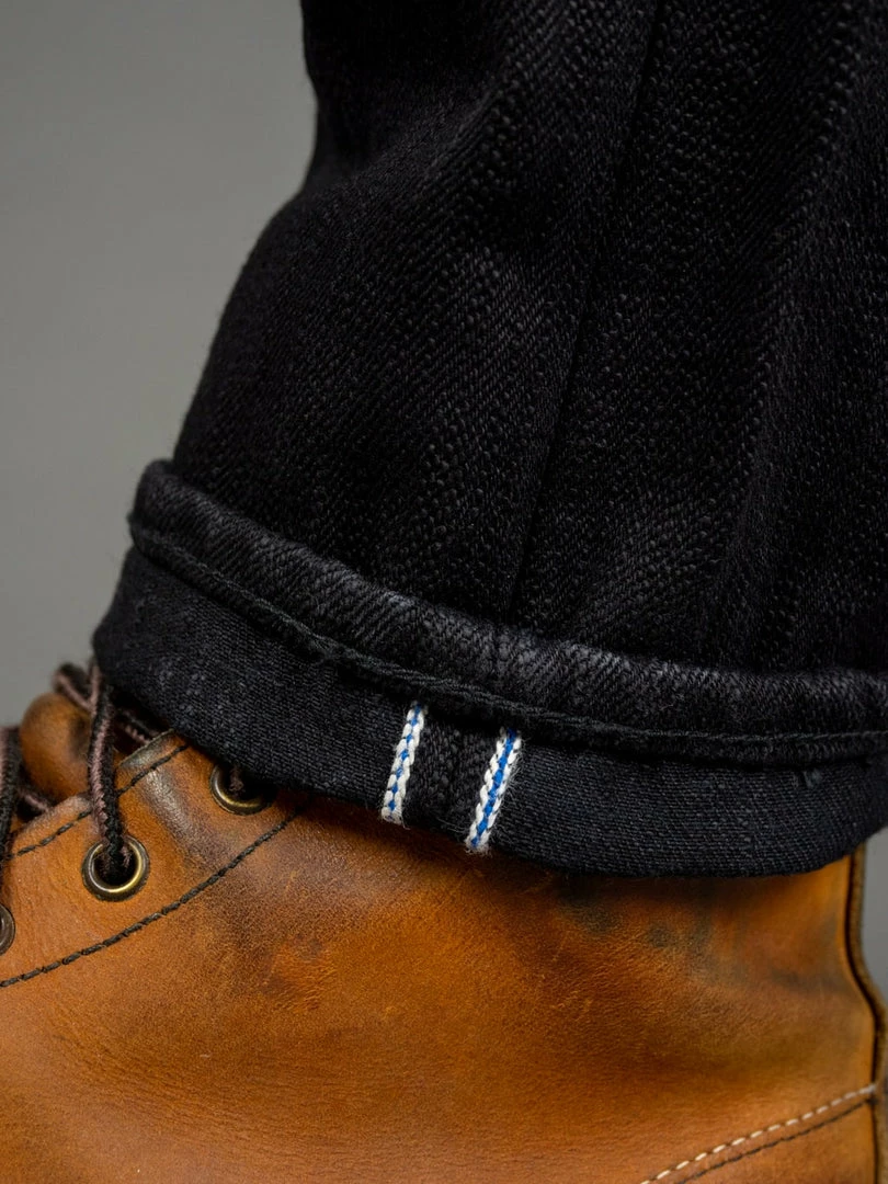 A workhorse pair of black jeans is as much a foundation piece as a white T-shirt in any man’s wardrobe. This beautiful pair is the double black version of the heavyweight Extra Slub selvedge denim from Pure Blue Japan, a unique fabric well known for its uneven, 3D slub texture the brand is renowned for. The colour and density vary throughout due to the inconsistency of the vertical yarns, giving a lovely, subtle rain effect.