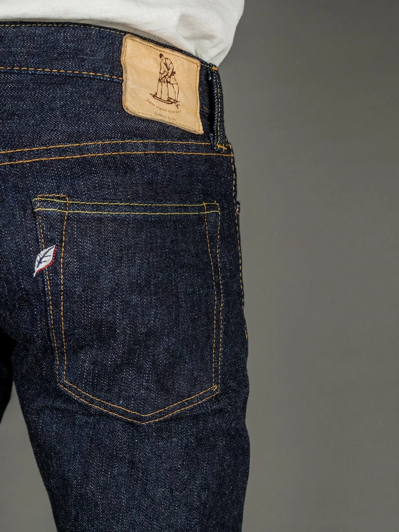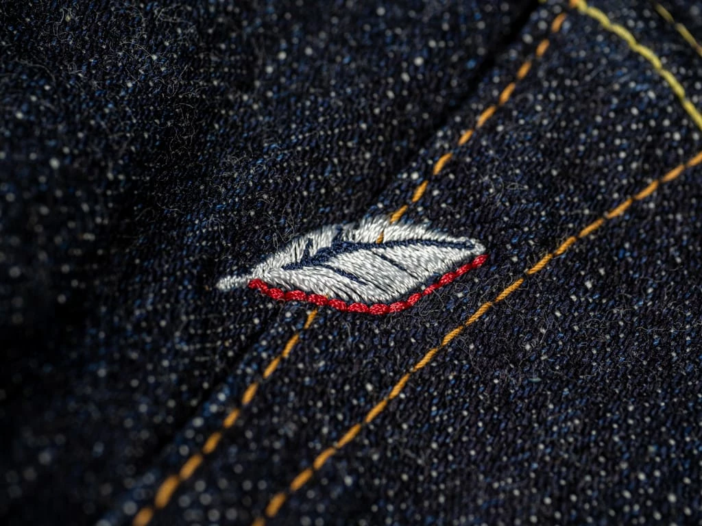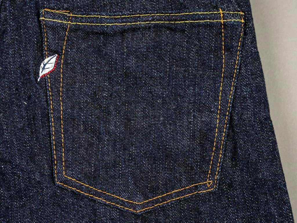 The jeans are made with all the superior-quality Pure blue Japan details such as iron buttons, high-quality pocket bags, heavy-duty bar tacks, long stitching, a custom lambskin leather patch and the signature Pure Blue Japan “shoai” embroidery (Indigofera leaf).