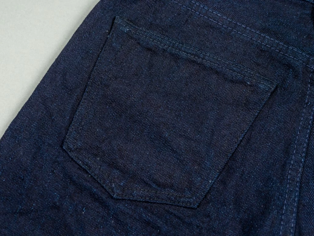 The brand developed a 18oz fabric based on their iconic XX denim for this double indigo rope dyed creation. Iwaya-san (the owner of PBJ) wanted a heavier version of their most demanded 14oz denim. So the brand is bringing it back on steroids. The result is fantastic: 18oz, very slubby and stunning texture. It has been low-tension woven on a vintage shuttle loom in Ibara, Okayama, so the fabric’s production is minimal.