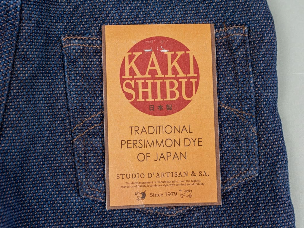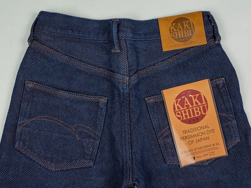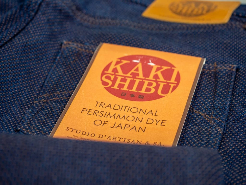 We’re excited to introduce the new Kakishibu Sashiko series from Studio D’artisan. The cotton yarns used in the warp have been skein dyed with indigo and the yarns used in the weft has been dyed with kakishibu, an all-natural dye fermented from the juice of unripe persimmons, in order to create this beautiful indigo-brown sashiko fabric. Given the labour intensive process of dyeing the yarns in a natural dye like Kakishibu, only a small production lot of these jeans can be made.