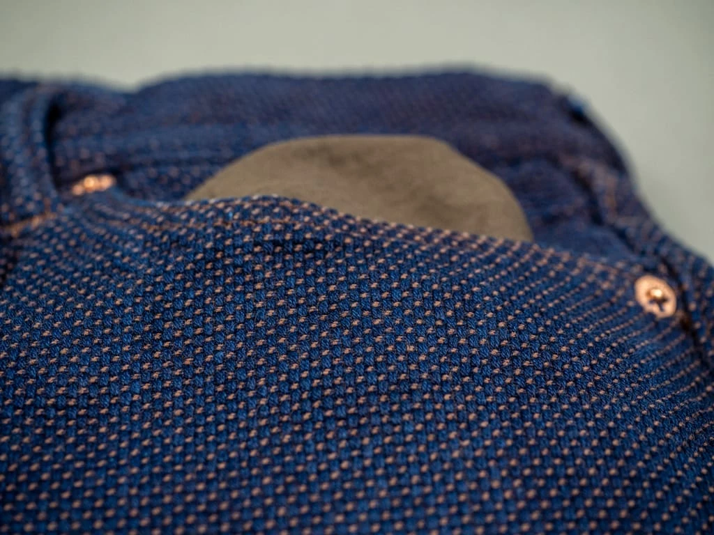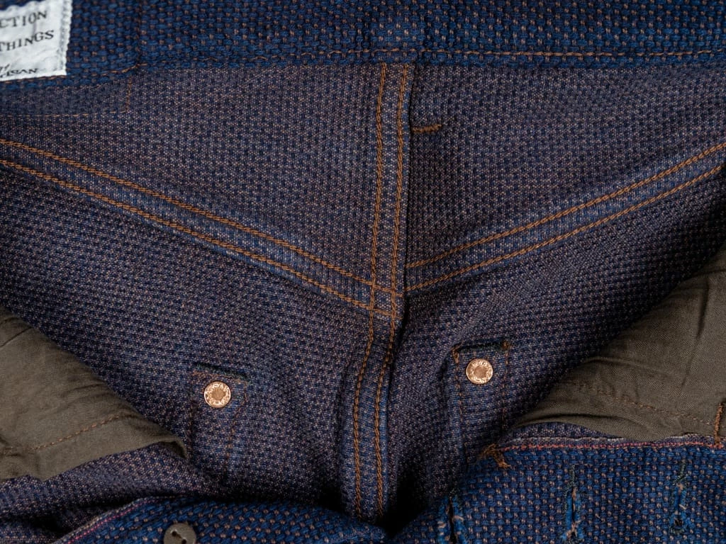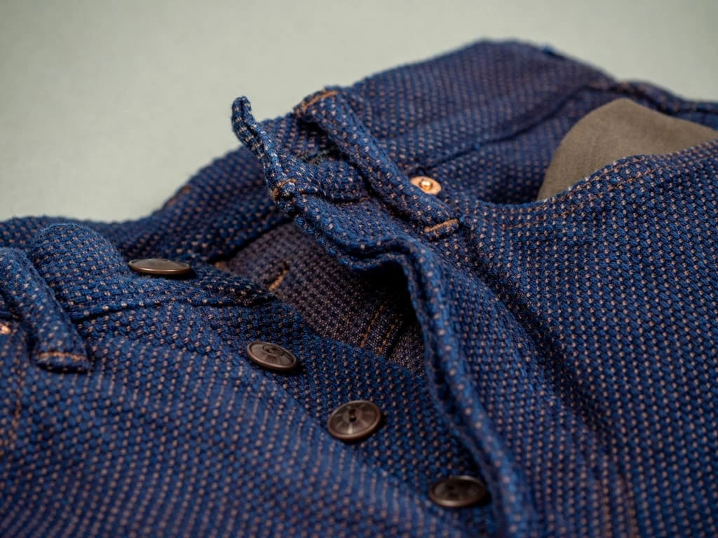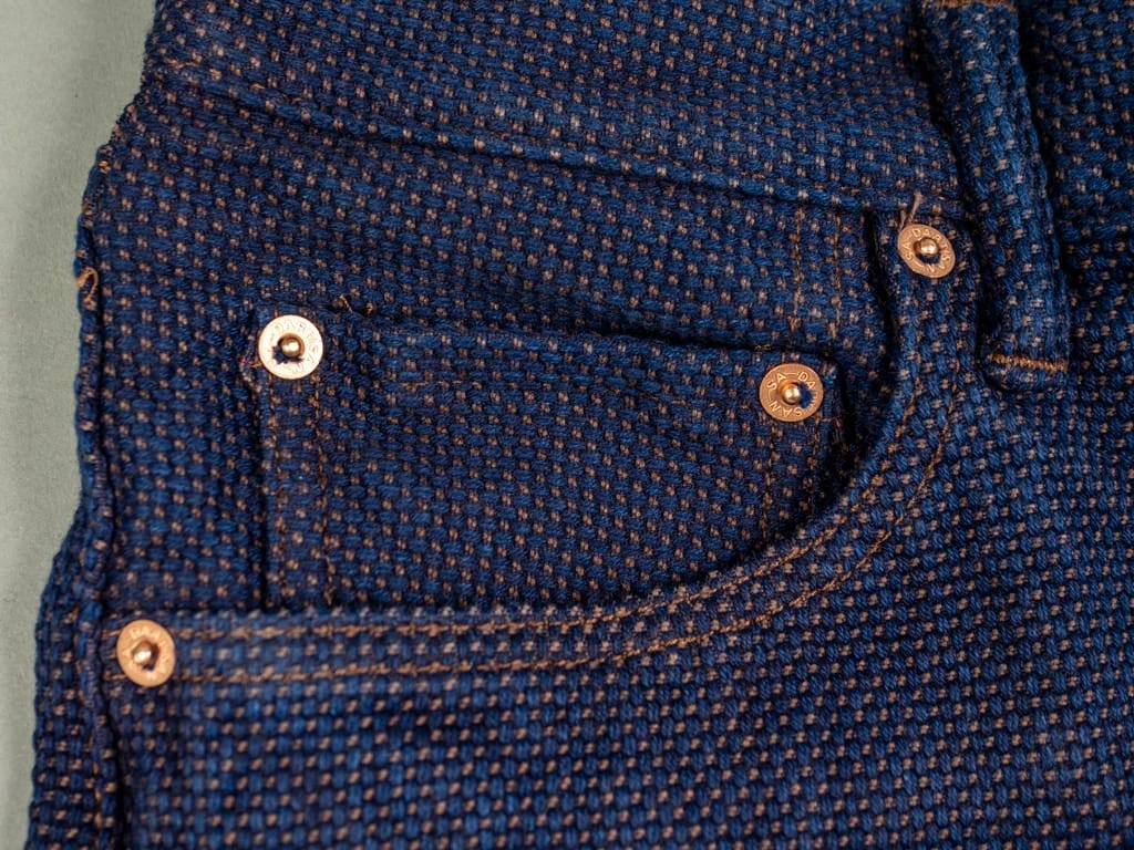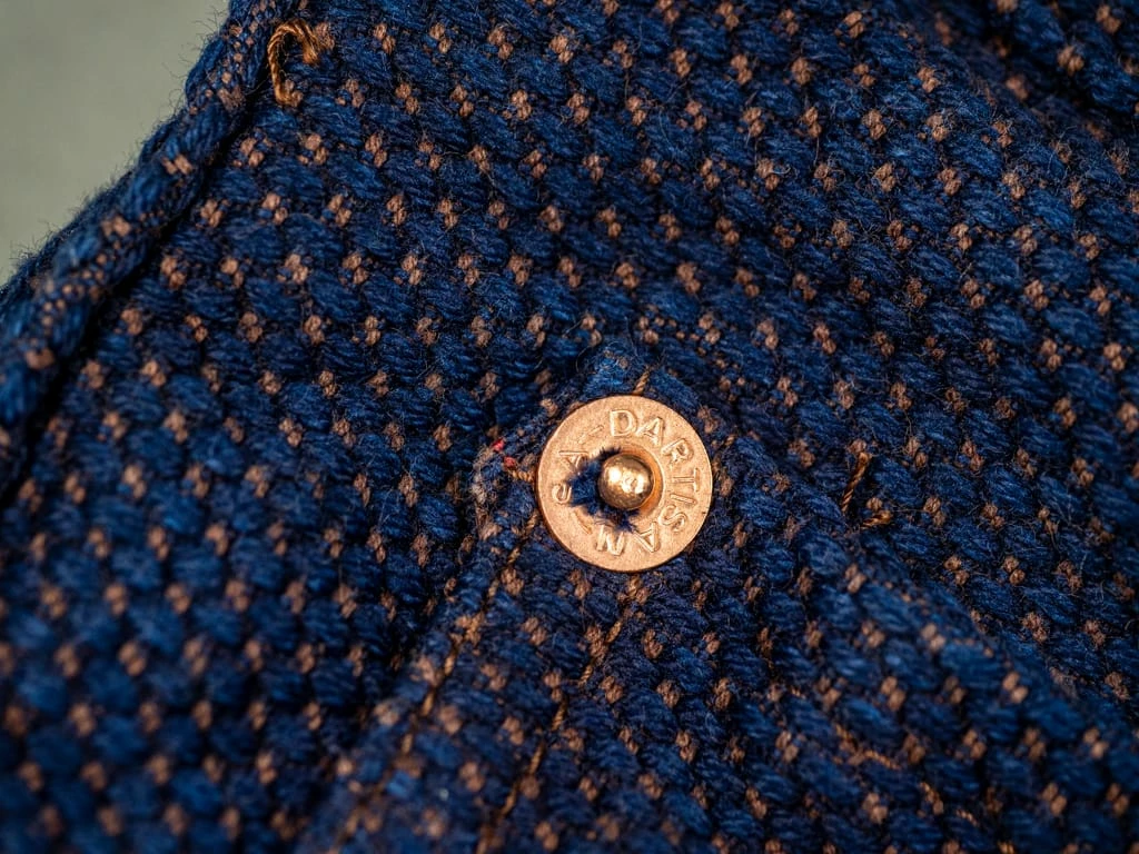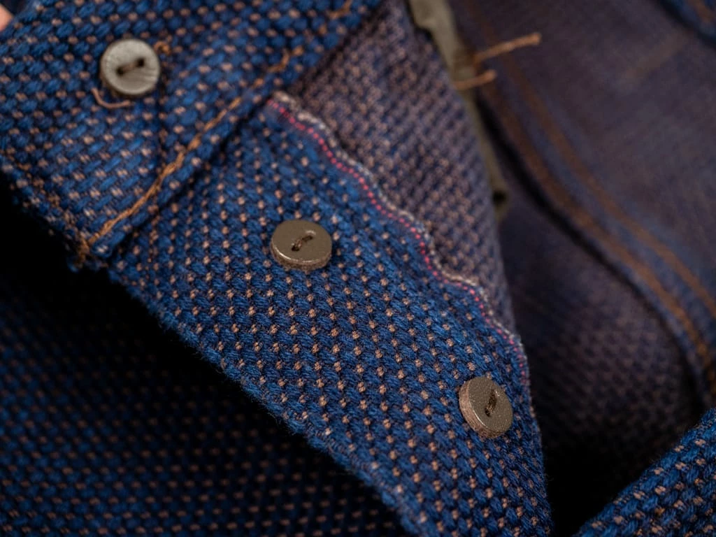 The most remarkable attribute of these jeans is that they will reveal a unique patina over time. Studio D’artisan has made this sashiko with jacquard weave and exquisite craftsmanship. The buttons are made of Corozo nut, sustainably sourced from Central and South America. The corozo nut is not cut down from the tree; instead, they wait for the nut clusters to drop to the ground from the corozo, or Tagua palm tree. The nuts are then dried for three months once they have become hard and ready to craft. The large nut is then cut into slices, shaped, and made natural buttons.