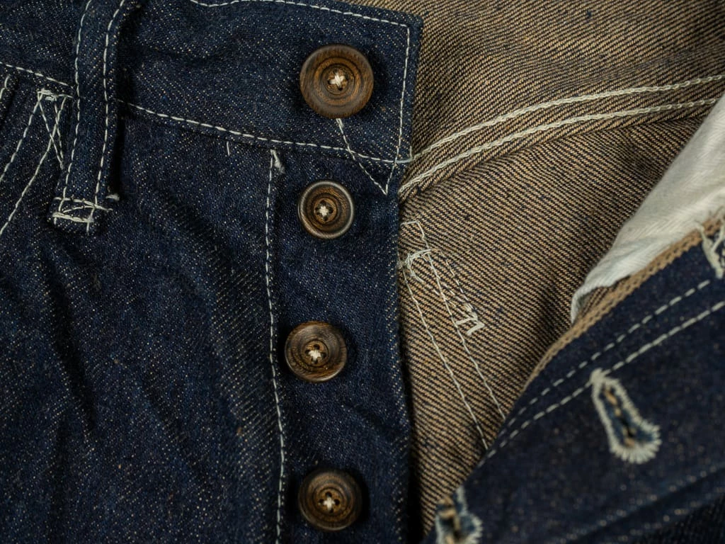 For this Limited edition, Studio D’artisan has omitted all the metal hardware in an attempt to create a more conscious and natural pair of jeans. With both the warp & weft using a natural Fox cotton Foxfibre®, The warp yarn is dyed with Awa Masai natural indigo which is grown in Tokushima. The composition of the Selvedge also takes a sustainable stance and four-button fly featuring Original Studio D’Artisan leather-backed wooden buttons and a sewing thread made of pre-dyed cotton complete the full organic construction.