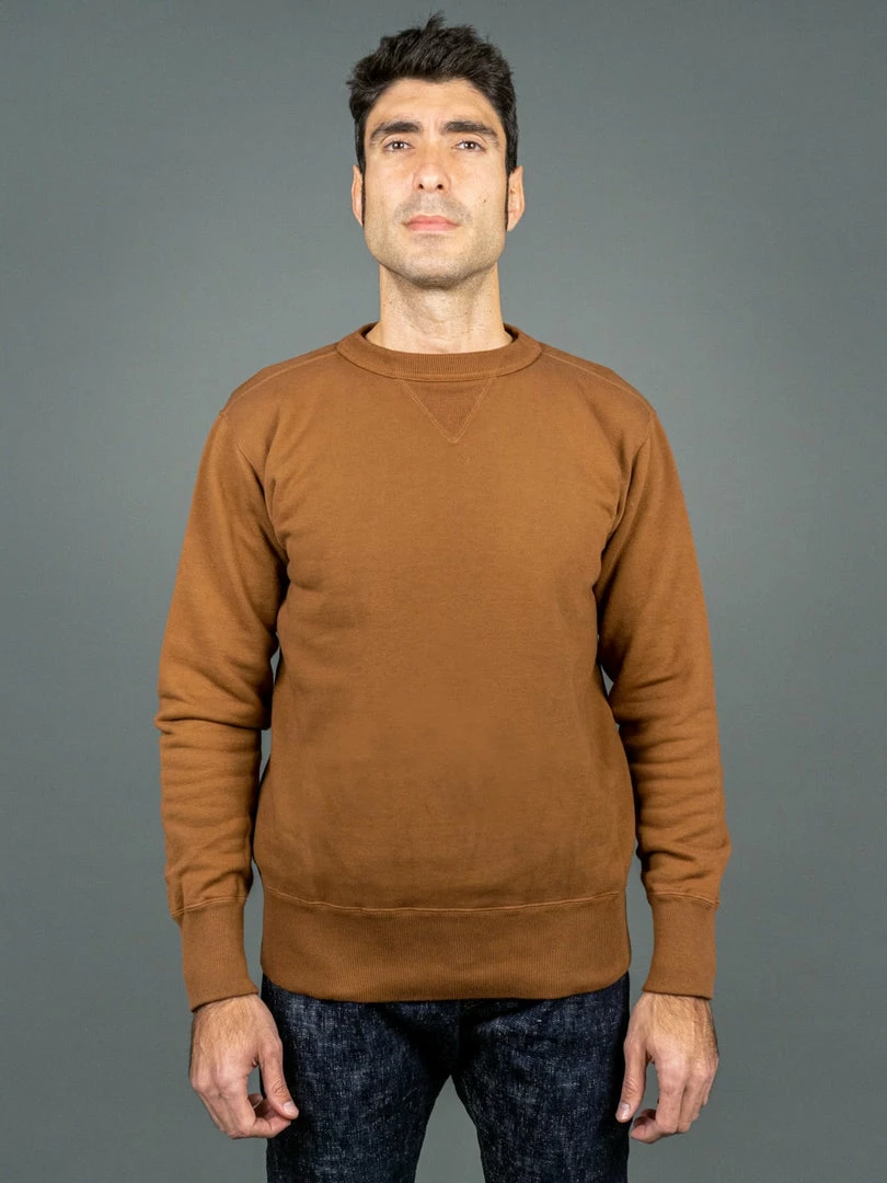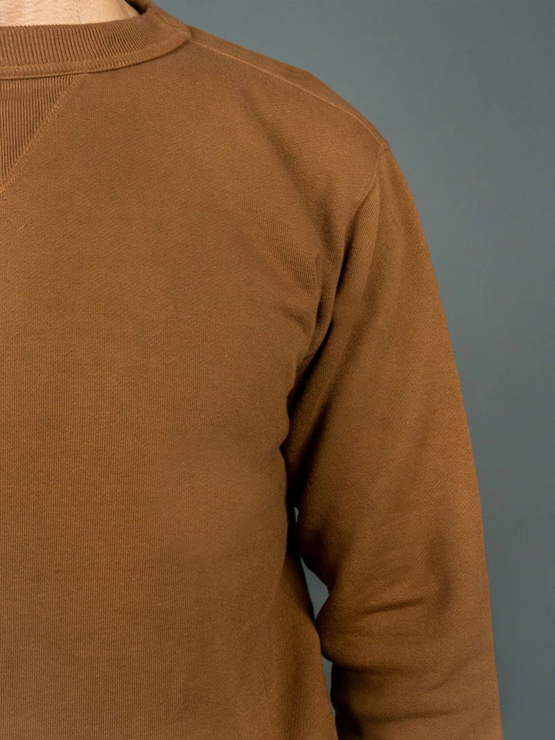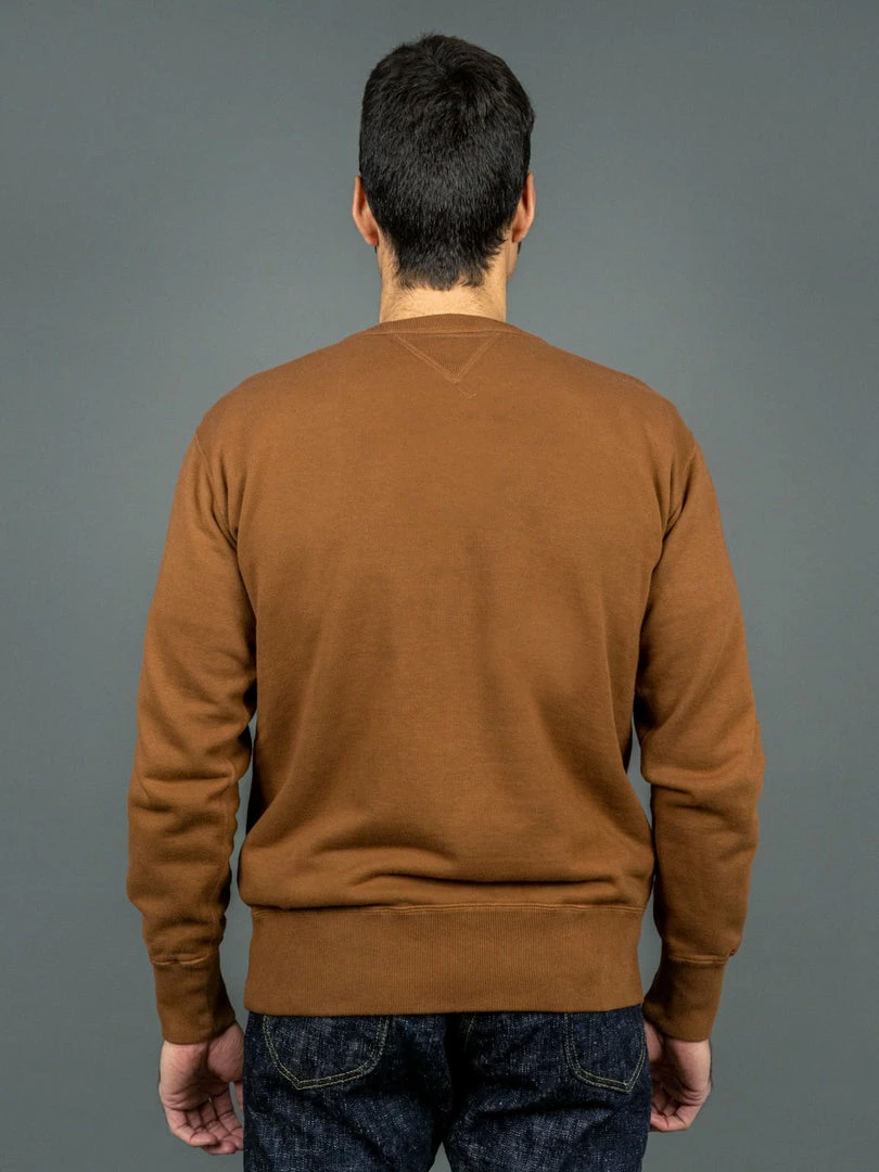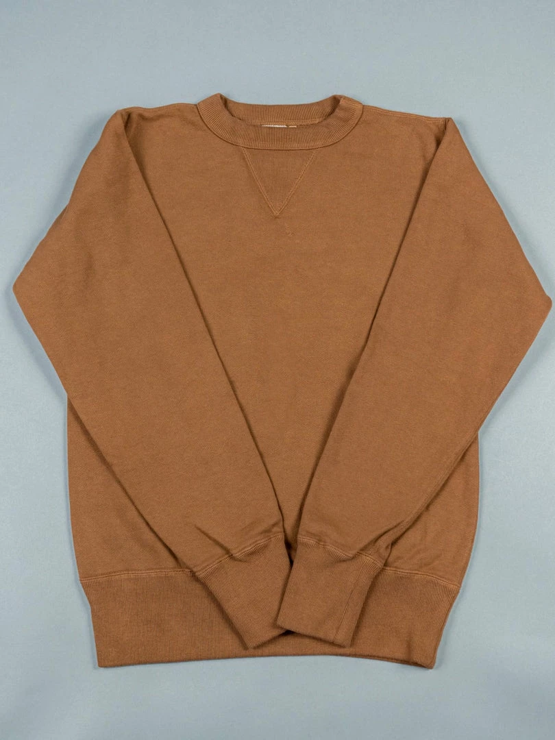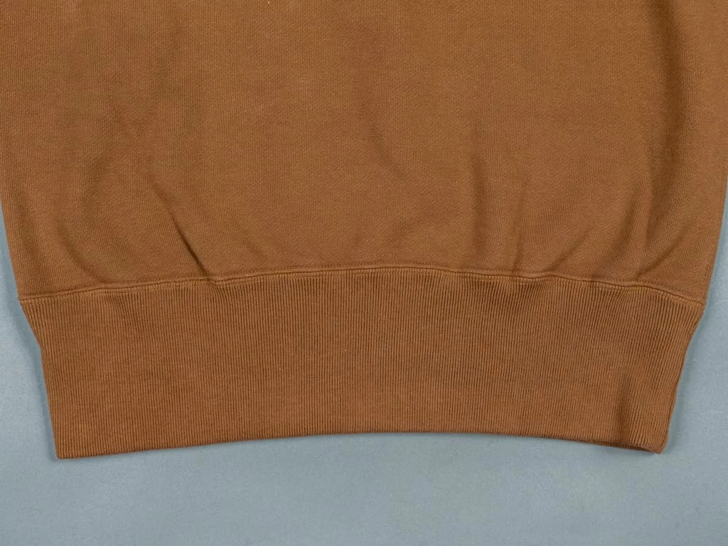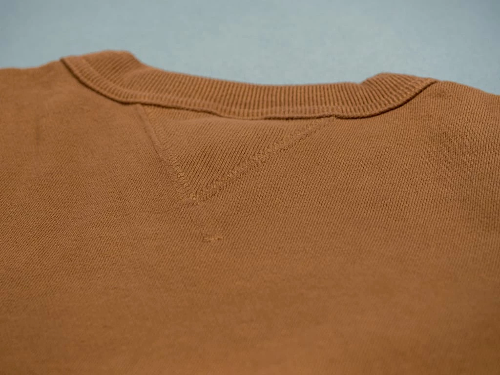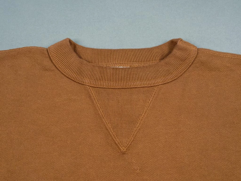 The sweatshirt has been woven with a sinker machine in Wakayama, Japan and features ribbed cuffs, hem and collar, V-neck and double-needle construction.