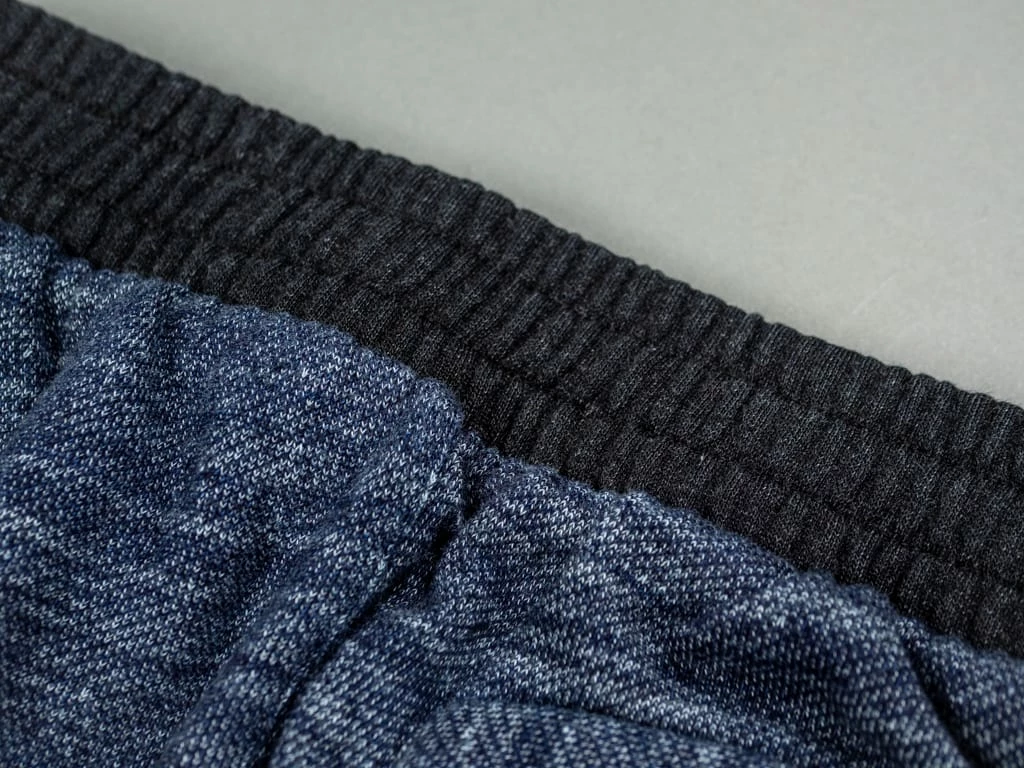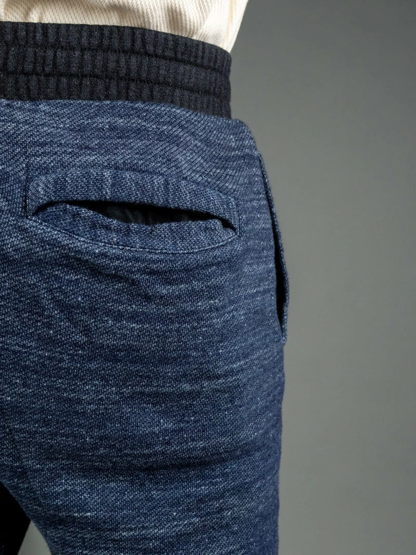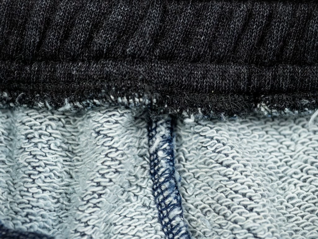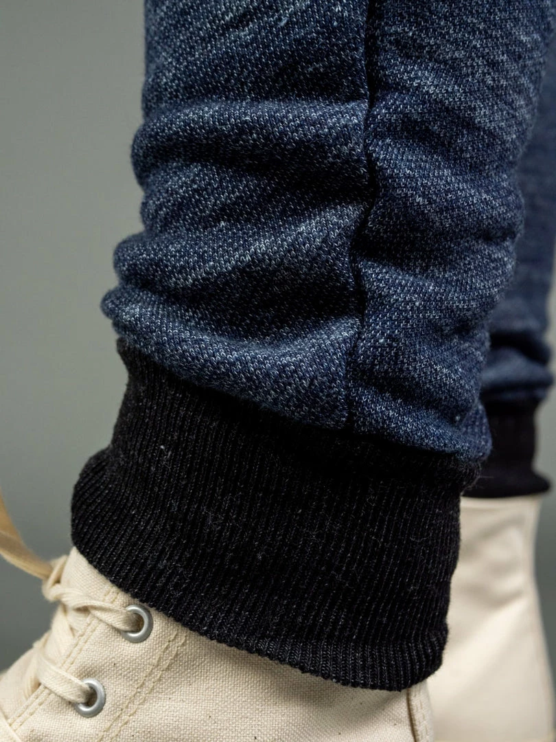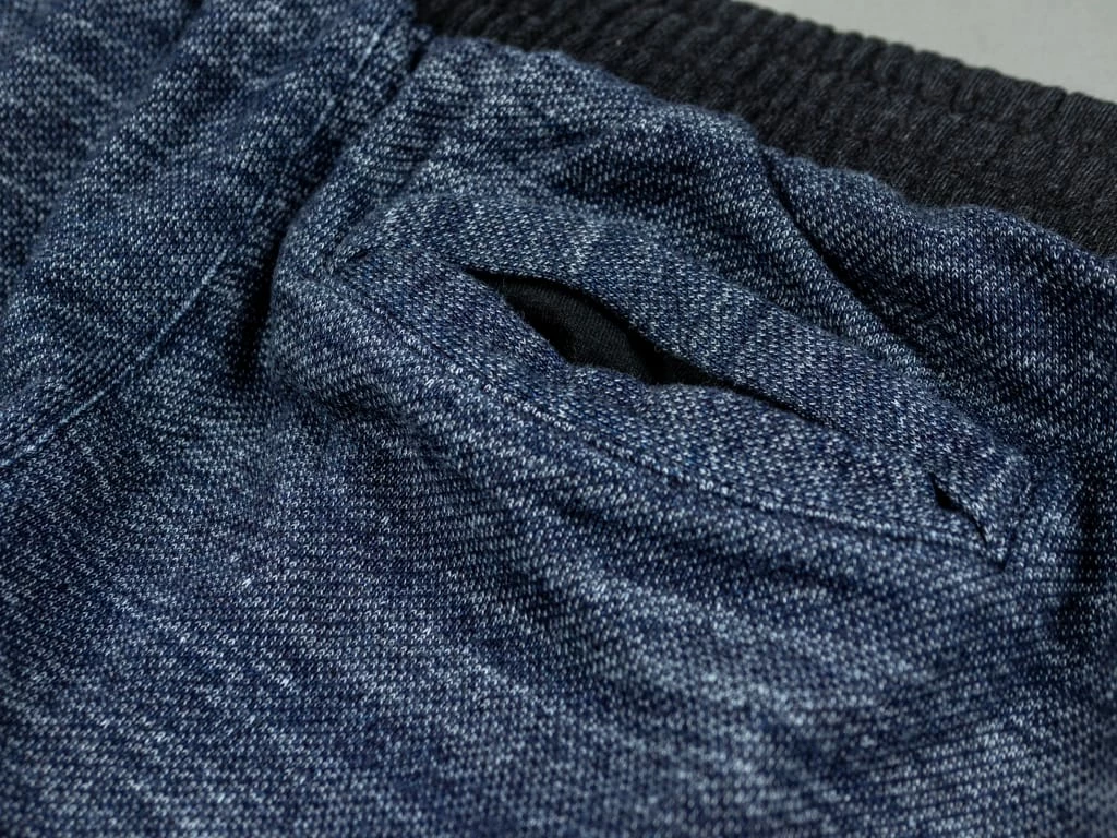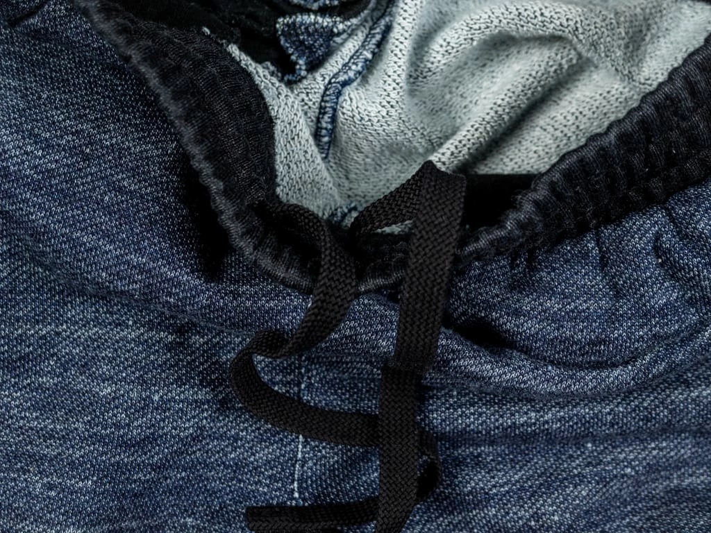 But comfort is not the only thing that stands out about these sweatpants. Dyed with natural indigo and pure indigo, the salt and pepper look will become more apparent with wear. Tanuki calls this heavy loopback sweat fabric “Hayate”, which translates into something like tempest or gale as it has a very dramatic texture. This is a substantial fabric and feels very sturdy yet is very comfortable to wear.
