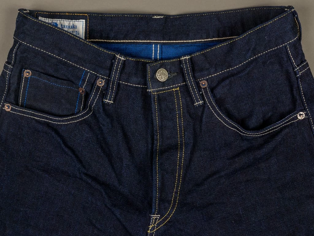The jeans are made with all the superior-quality Tanuki details such as copper buttons, embroidered logo back pocket detail and the iconic Tanuki custom vegetable-tanned deerskin leather patch. Tanuki has included a Japanese extra-durable herringbone cotton-lined fabric in front pockets and an electric blue and white selvedge ID.