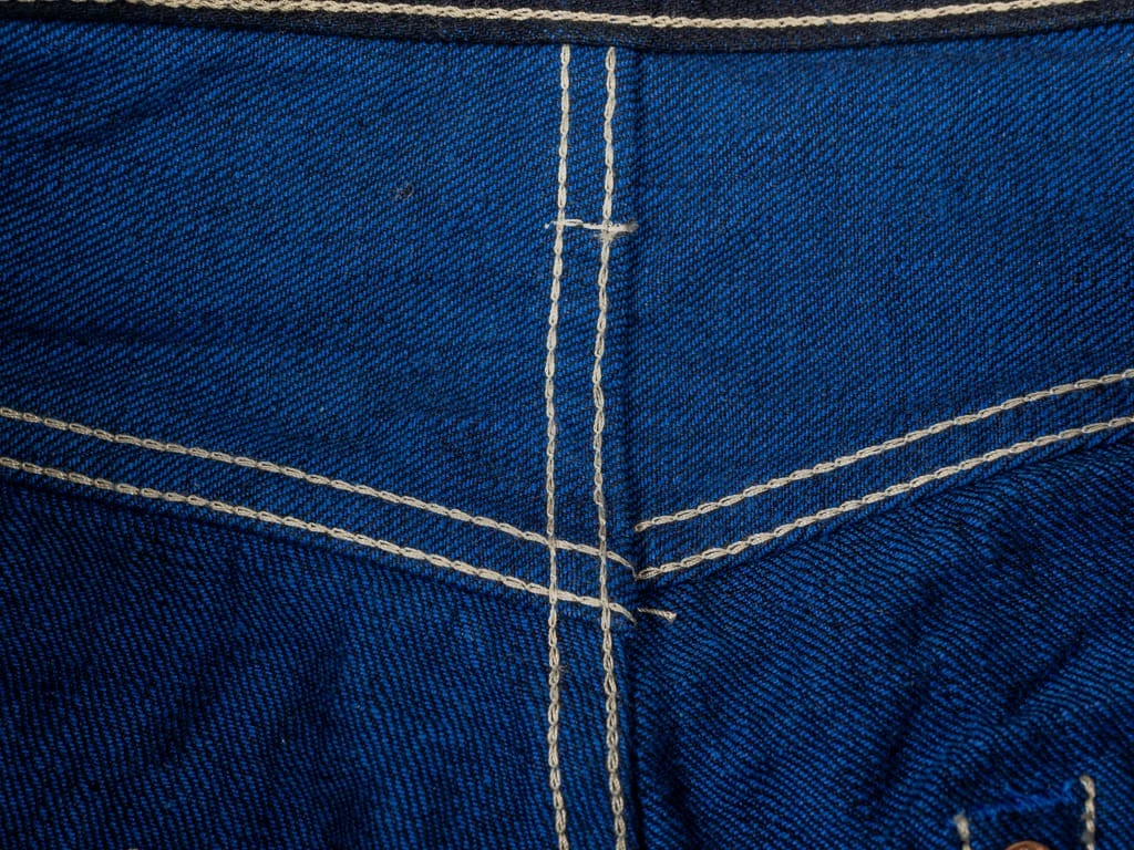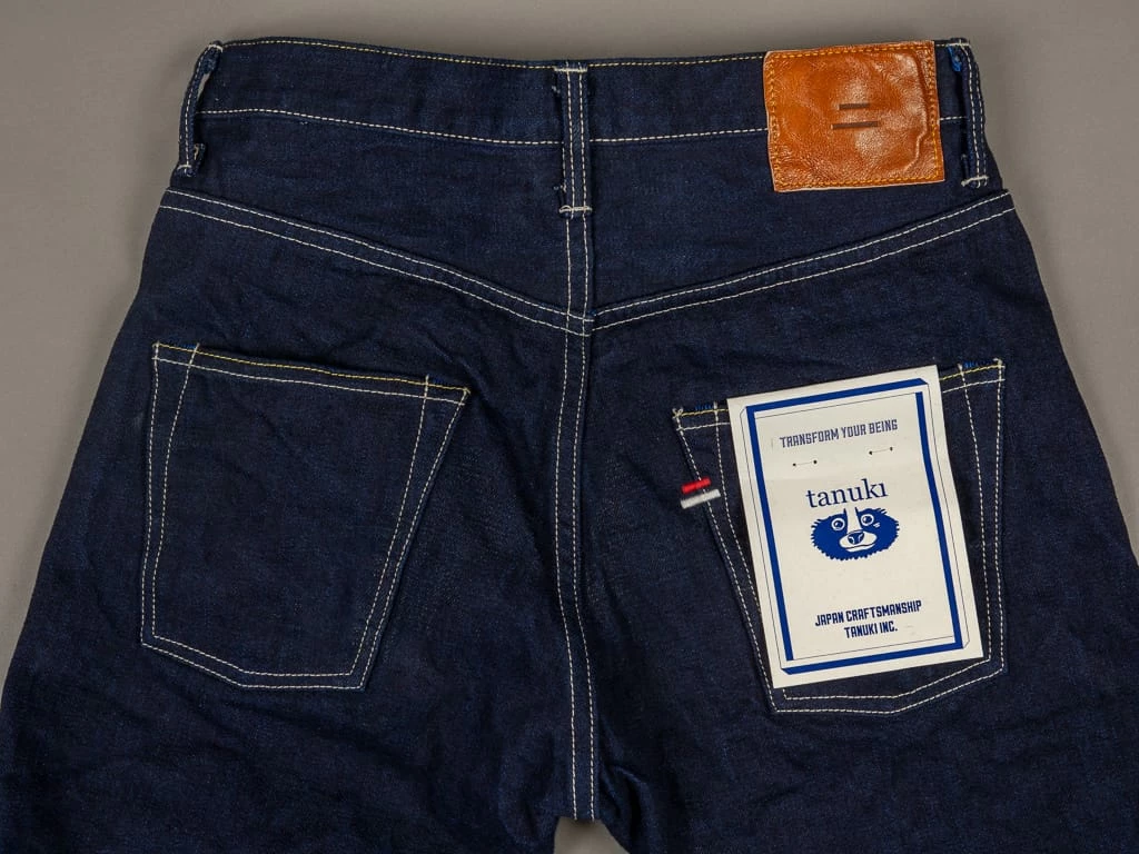 Near the back pocket, there is the embroidered Tanuki 二 (Ni) logo, two parallel lines in Japanese Kanji representing the number 2. The lower line represents the past, tradition, the standard, peace. The upper line represents the future, change, strength. The red and blue colours of their logo refer to Japan’s flag, honouring their roots as denim artisans.