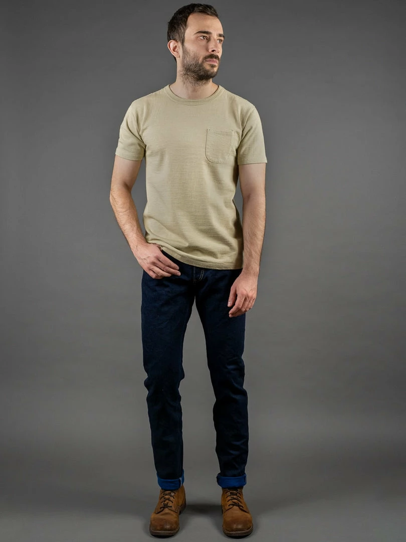 The fabric is woven with a low-tension technique that feels more breathable than a standard 16.5oz fabric. It has a beautiful slubby texture with a fantastic hand feel. Its irregular appearance belies the surprisingly smooth comfort for the wearer.
