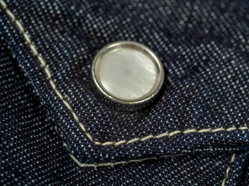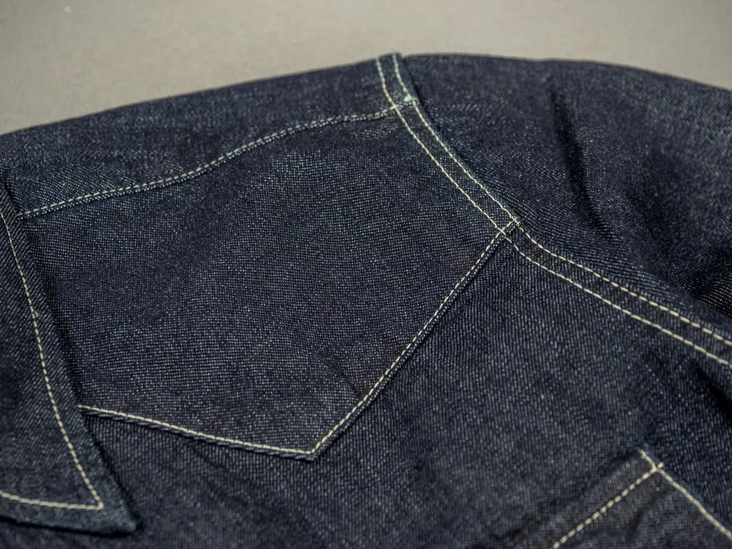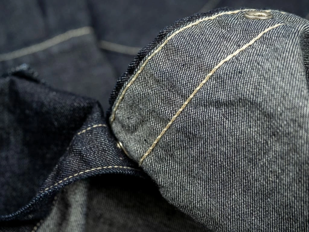 The same fabric as the TCB Ranchman shirt. An 8.5oz indigo denim with some irregularity on the surface. The cotton used for the denim fabric is grown in California. The denim is woven by vintage looms very slowly for the natural unevenness.