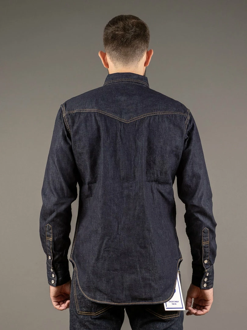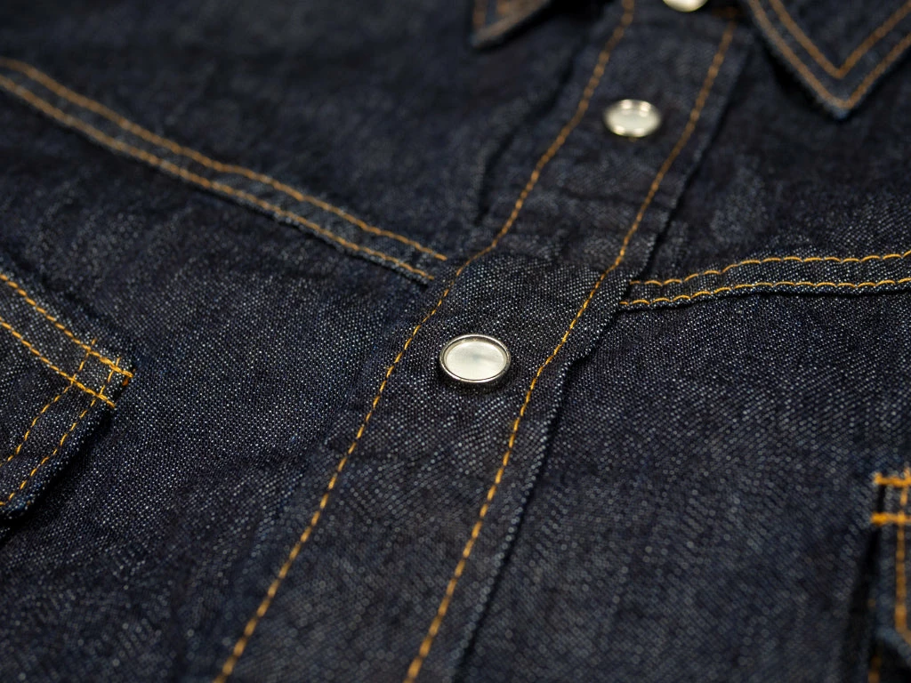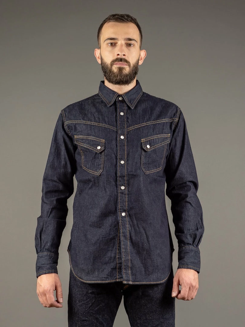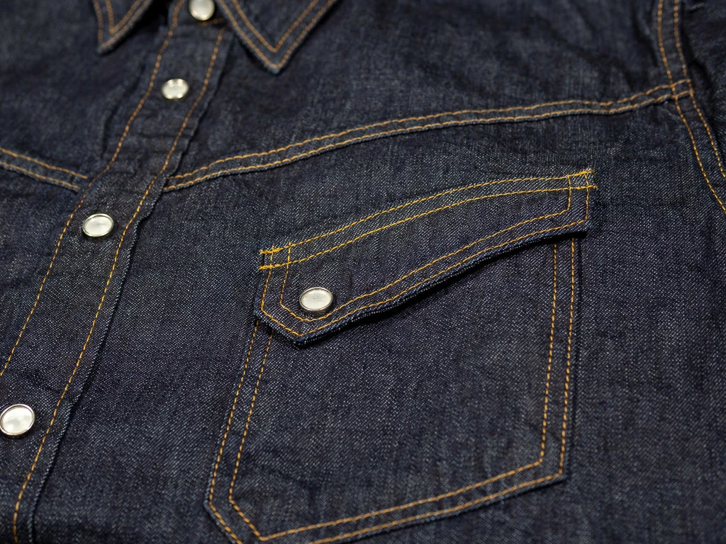 The TCB Ranchman shirt is a reproduction of the classic American western denim shirts of the 1940s. Carefully reproduced to be as close to the original as possible but with a slightly updated fit for a more contemporary look and comfortable wear. It is made with a raw 8.5oz sanforized natural Mura denim fabric. From the fabric to sewing to silhouette, it is made with care down to the last detail. It has two western pockets in the chest, both with snap buttons made of white shellfish.