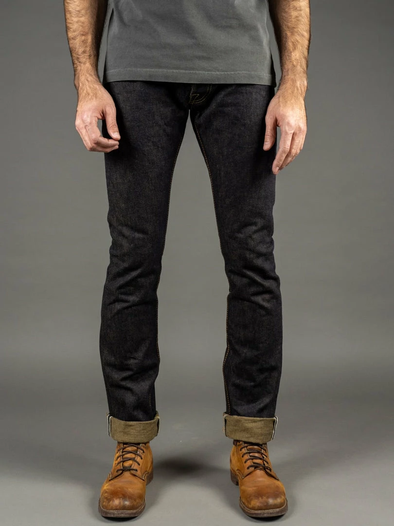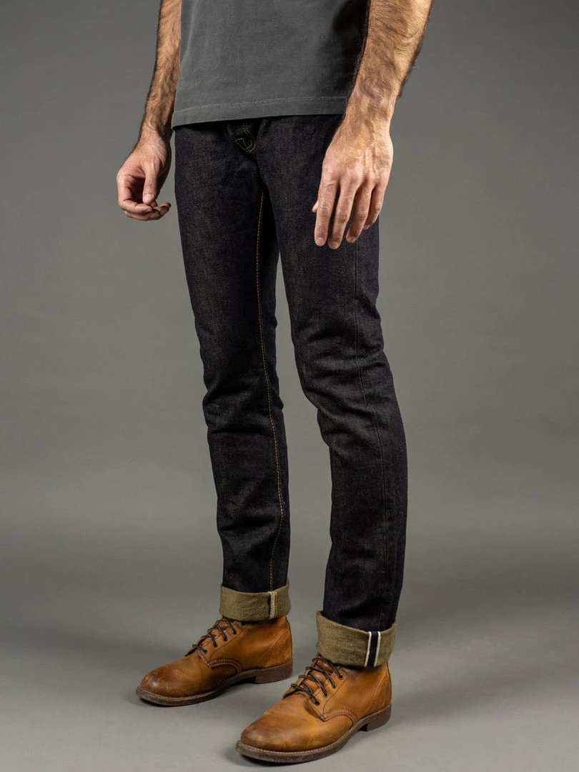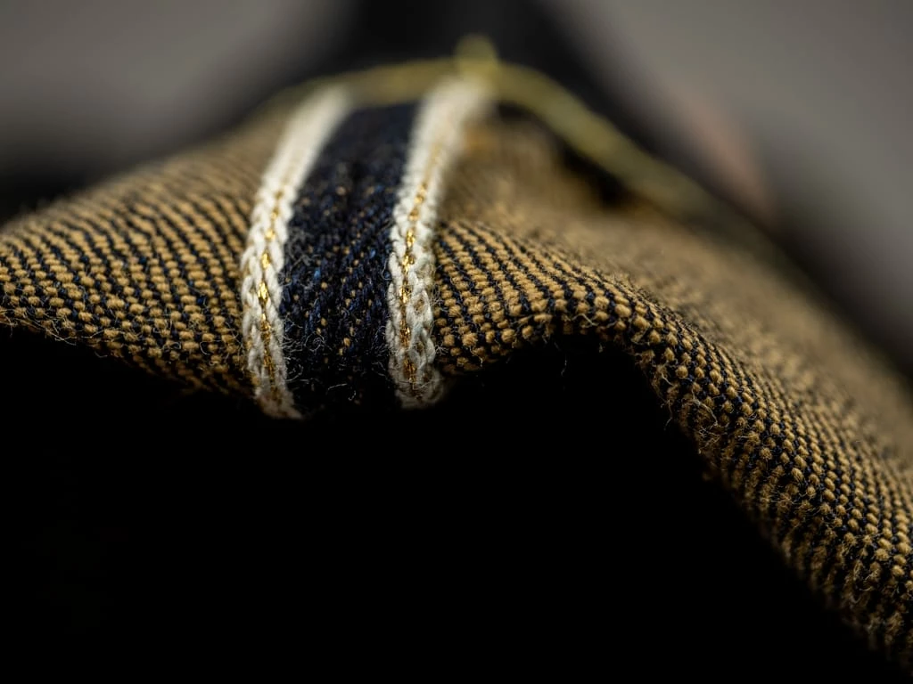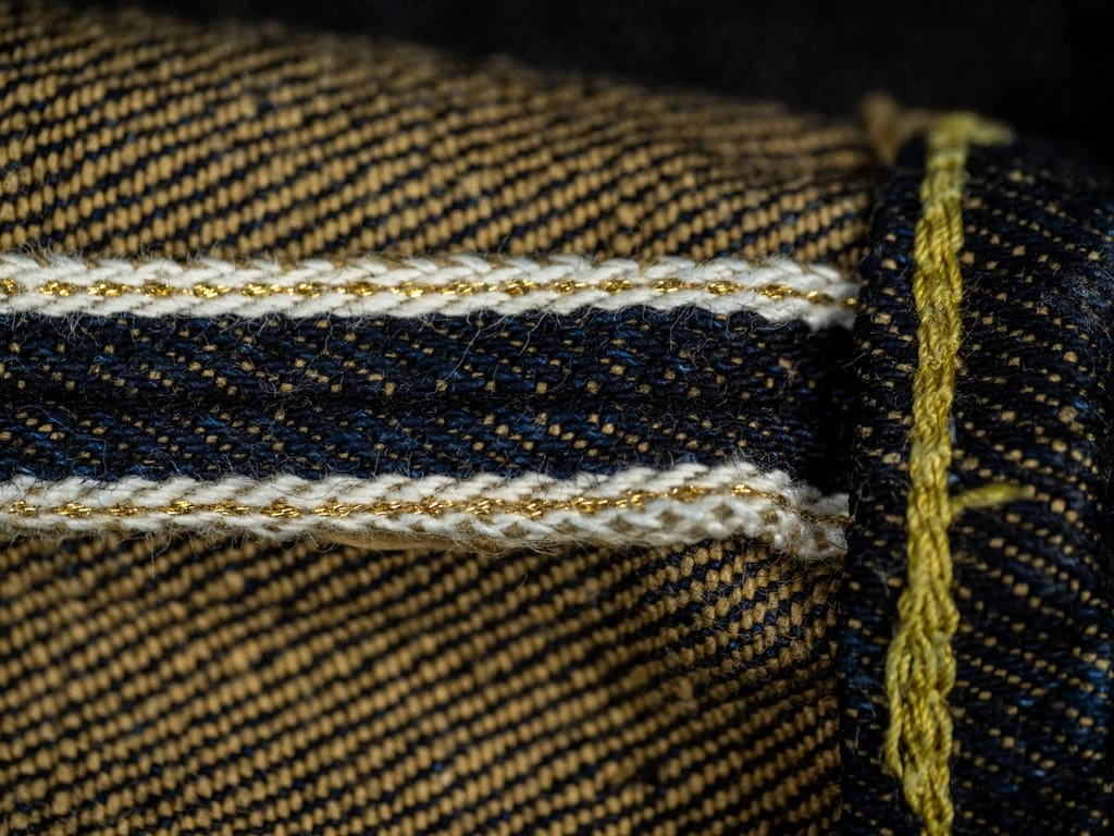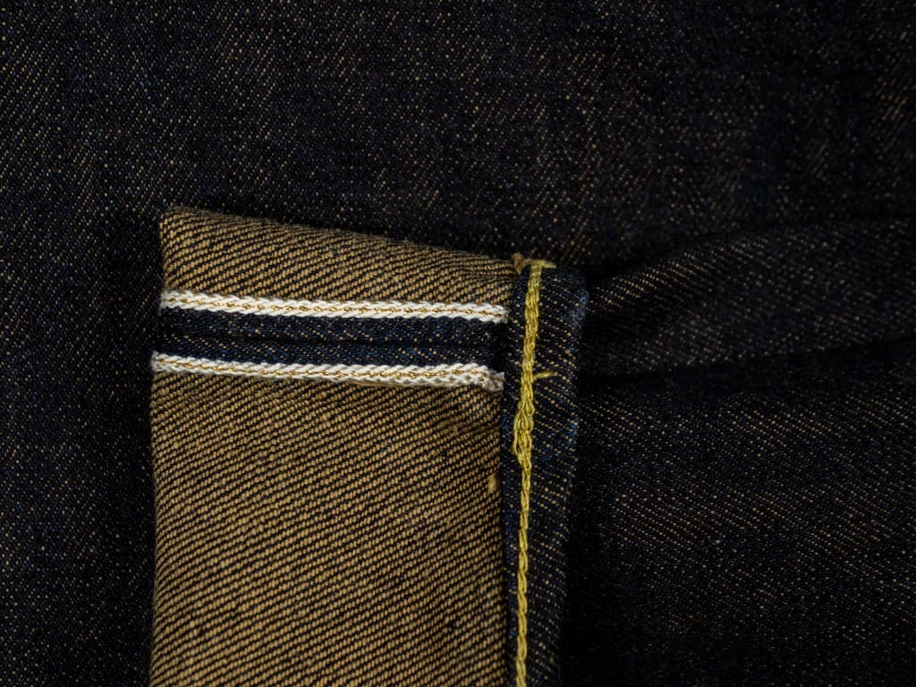 - Unsanforized selvedge 17oz heavyweight slubby indigo brown-beige weft fabric with a light brown rustic indigo tone. It is a one-wash version so expect no shrinkage