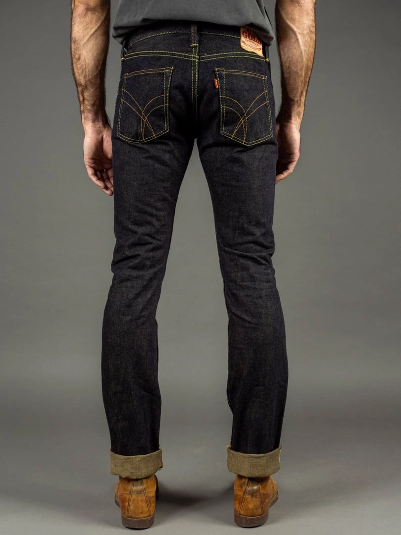 The “SG2109 brown weft” jeans are made of an unsanforized 17oz heavyweight slubby indigo brown-beige weft dyed fabric that adds character and a light brown rustic indigo hue. This fabric is made from 100% Zimbabwe cotton to create a rigid and slubby hand feel.