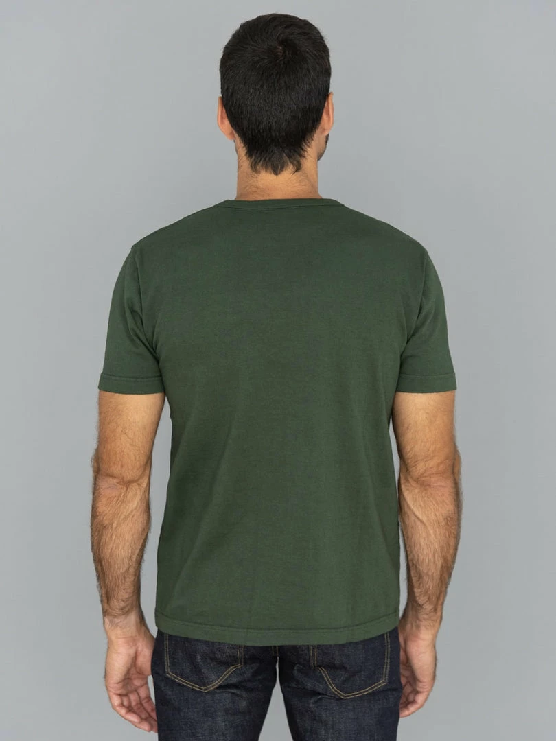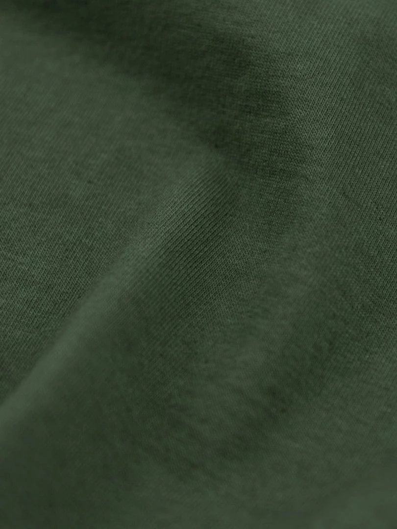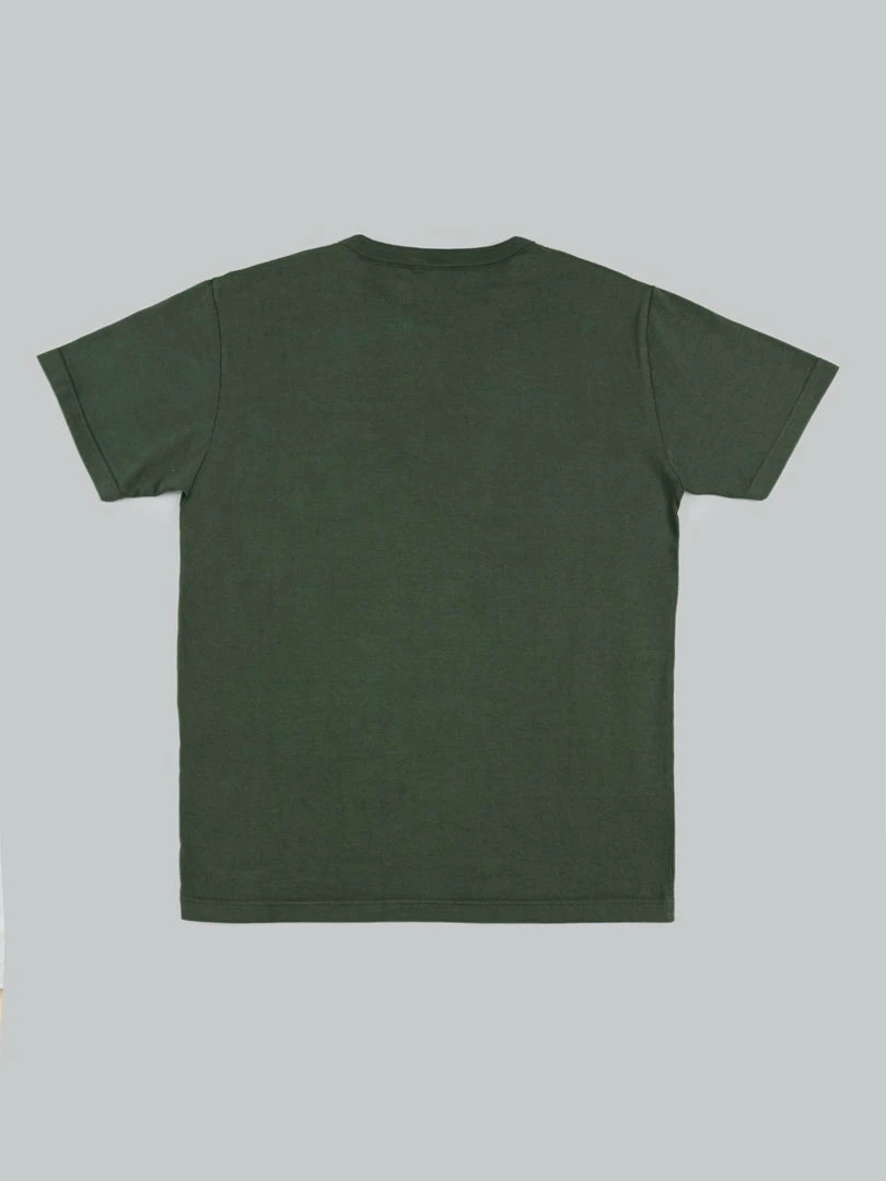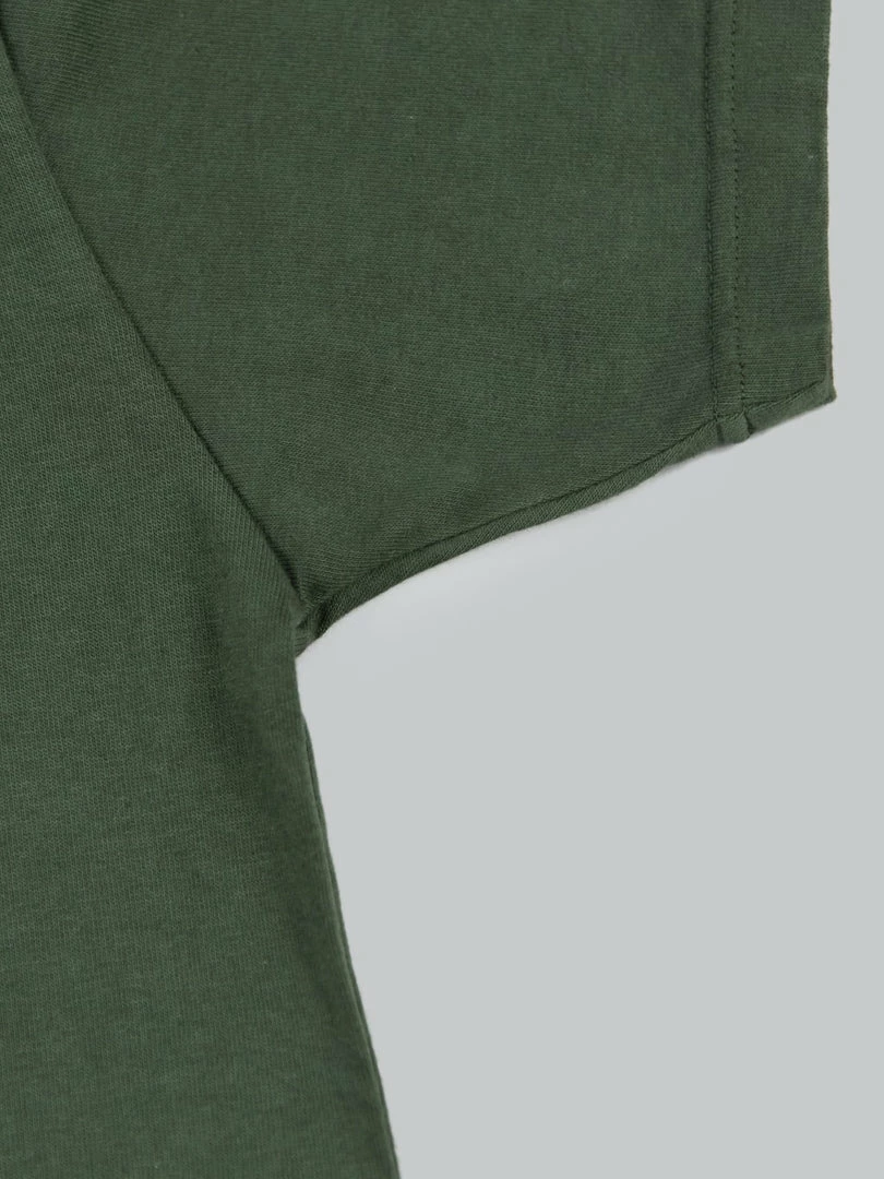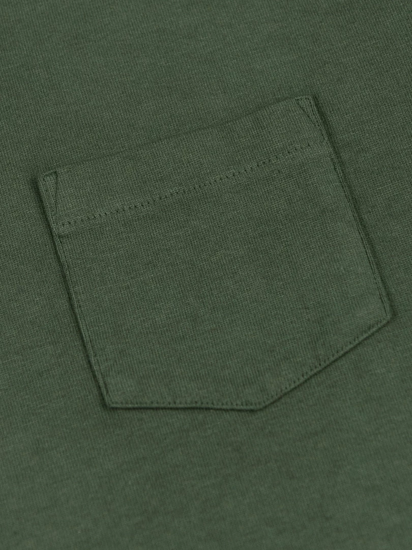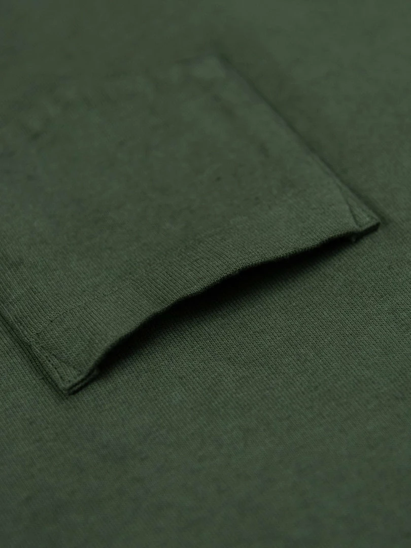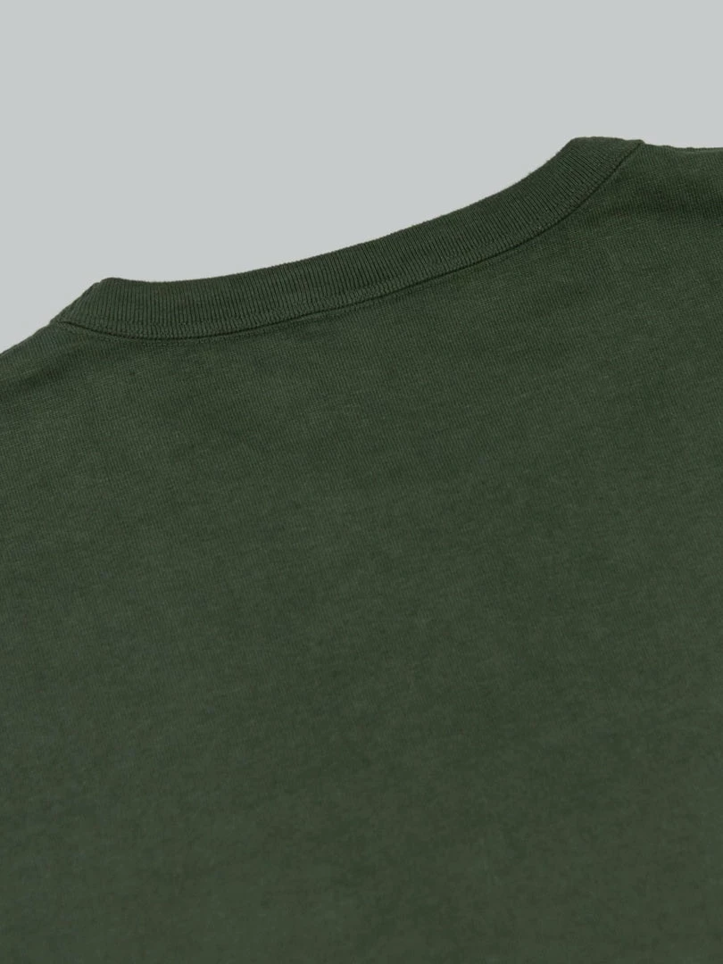 It is made from 100% cotton fabric called Tenjiku, which is gentle on the skin. This fabric is woven on a vintage sweatshirt loom and is achieved using 20 single yarns on the front and 30 on the reverse which avoids future skew after washes. The entire shirt uses an outstanding, highly skilled sewing process with a two-needle binder neck and double-needle stitched construction. It is finished with three white branded buttons.