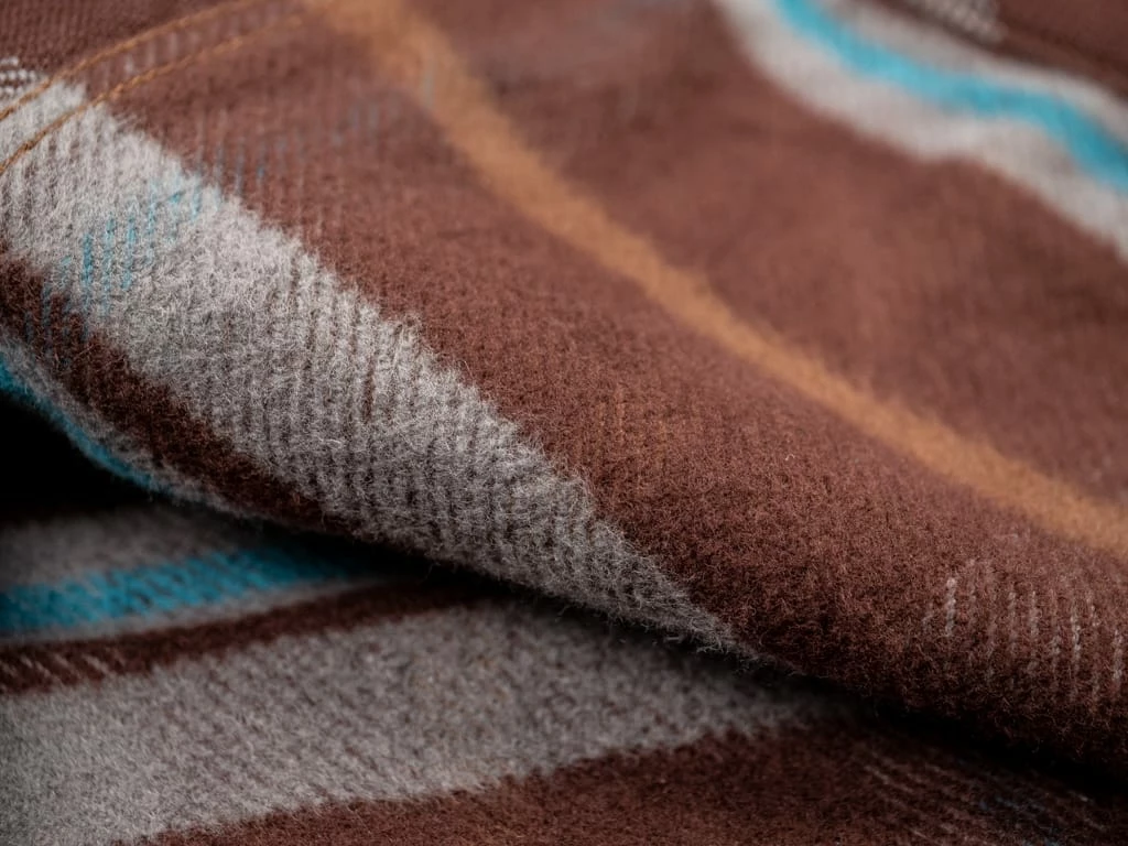 Due to its 15.5oz fabric, the UES extra-heavy flannel shirt is one of the thickest and most amazing flannel shirts in the world. Using the dobby loom, UES irregularly changed the length and location of the warp and weft to create an expression that differs from the usual twill. This creates the almost pear-skin-like texture on the surface of the material and is therefore called crepe weave material or Amundsen weave. The 15.5oz fabric has been woven using an old weaving machine named Schoenherr. This machine does not excessively pull the thread and so produces the soft texture.