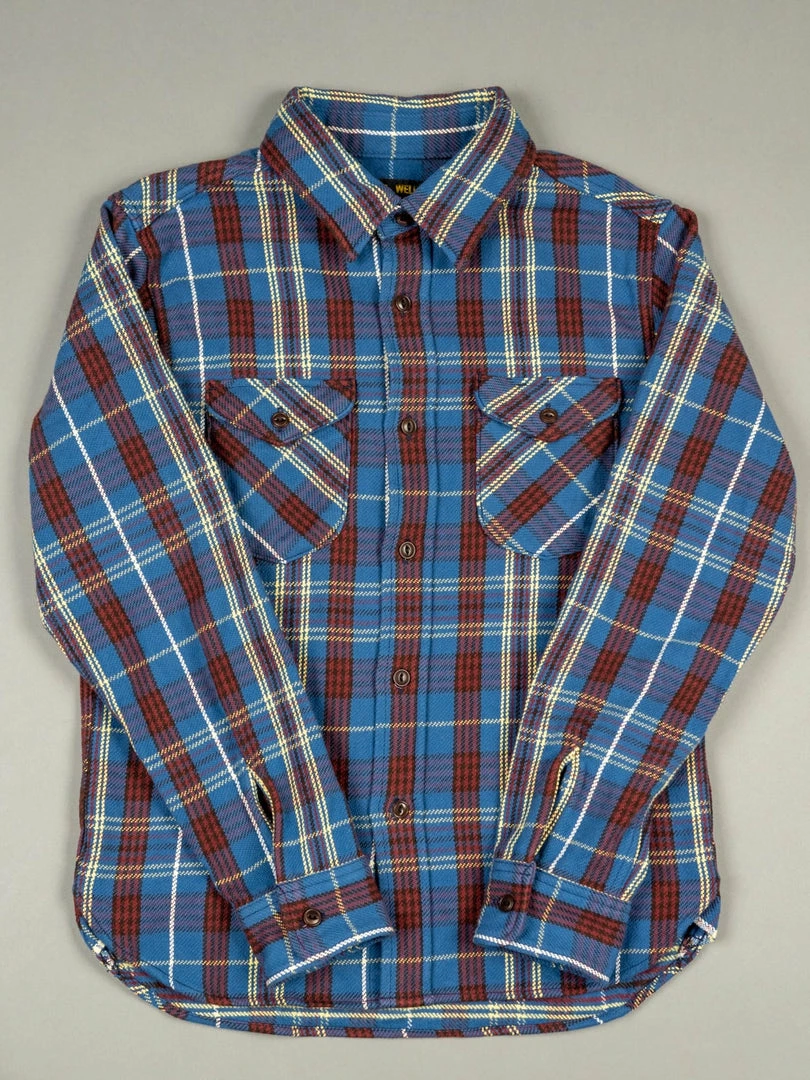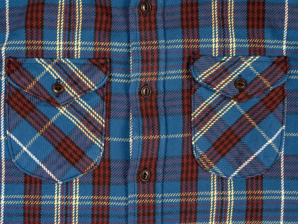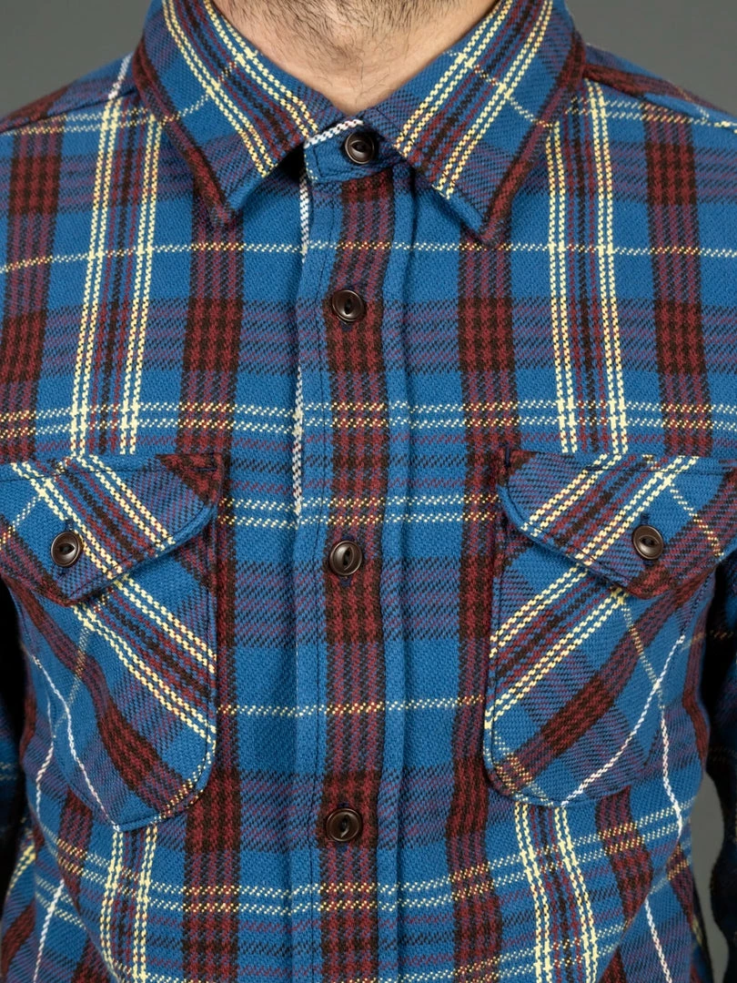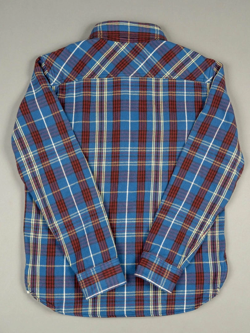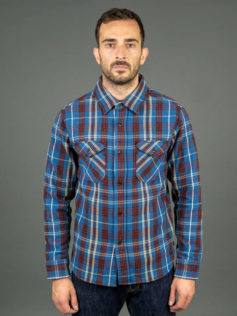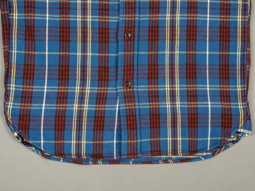 With a 14.5oz fabric, the UES heavy flannel shirt is one of our favourite flannels in the world. The fabric has been woven on old shuttle looms in Okayama by UES Denim, creating a rough exterior and a super-comfortable interior weave.