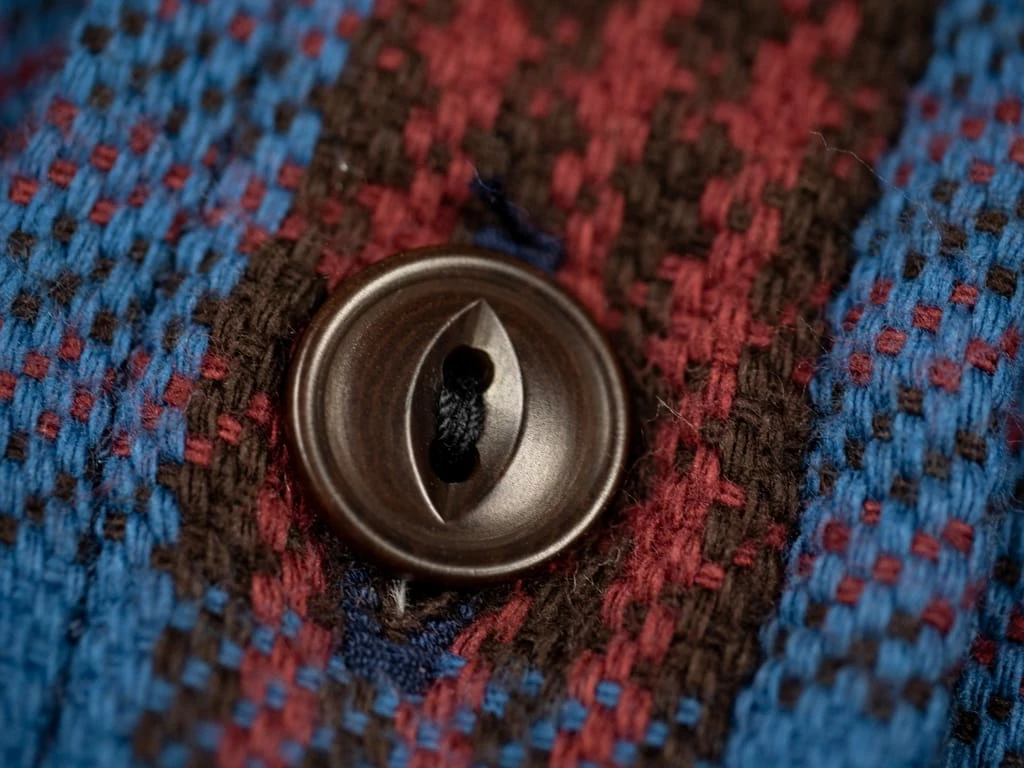 The buttons are made from ivory palm nut with a beautiful gradient tone. Ivory palms are medium-sized-to-tall palms reaching up to a height of 20 m, with pinnate leaves. The “nut” is covered with pericarp, which is removed by animals. They help counter both the destruction of the rain forest and the elephants. For many years the buttons on uniforms worn by U.S. soldiers came from ivory palm nuts. Like so many natural dyes and textile fibres, vegetable ivory has been replaced with less expensive synthetics.