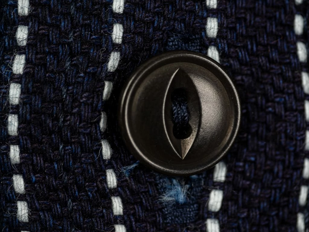 The buttons are made from ivory palm nut with a beautiful gradient tone. Ivory palms are medium-sized-to-tall palms reaching up to a height of 20 m, with pinnate leaves. The “nut” is covered with pericarp, which is removed by animals. They help counter both the destruction of the rain forest and the elephants. For many years the buttons on uniforms worn by U.S. soldiers came from ivory palm nuts. Like so many natural dyes and textile fibres, vegetable ivory has been replaced with less expensive synthetics.
